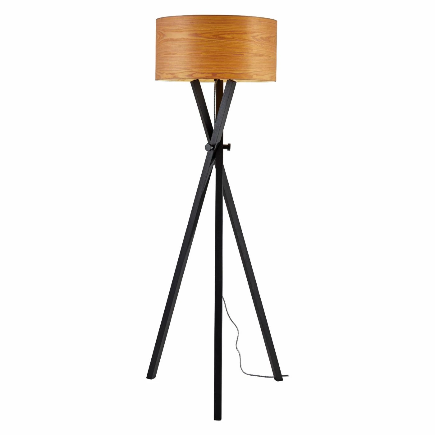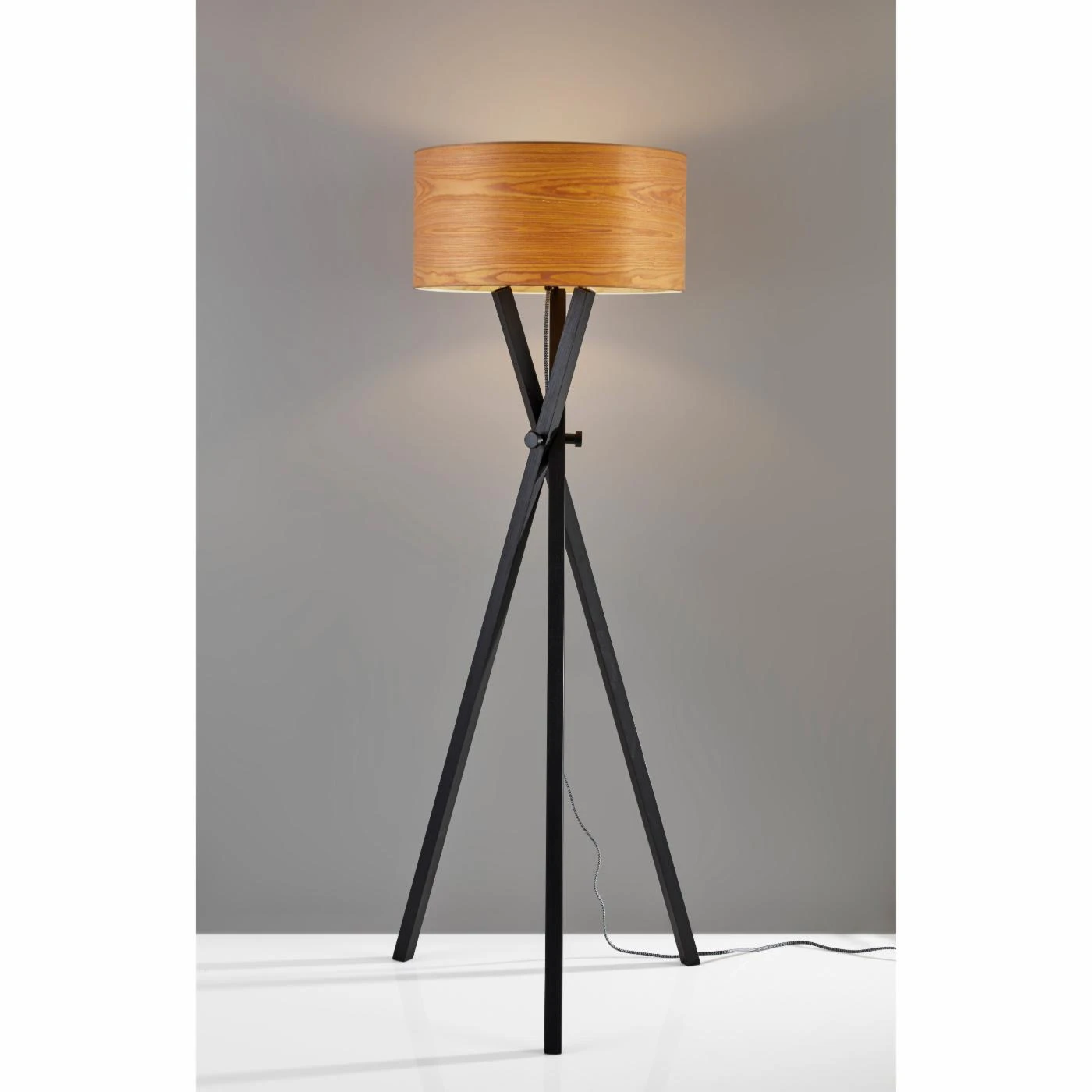 The Adesso Bronx Floor Lamp stands over 5 feet tall on sleek, boxy oak wood legs. It’s topped with a drum-shaped shade made from cherry wood veneer, and it has a prominent wood grain that’s highlighted when the light is turned on . The shade’s warm natural tones create a fashionable contrast to the black base. Plus, the protruding screwheads and fabric-covered cord bring added flair to the design.