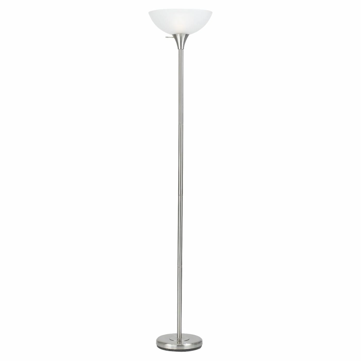 Towering high, the Cal Lighting BO-2055 Metal Torchiere Floor Lamp with Glass Shade brings an airy contemporary style to any room. Its look is perfectly rounded out by a brushed steel finish. Includes light bulb.