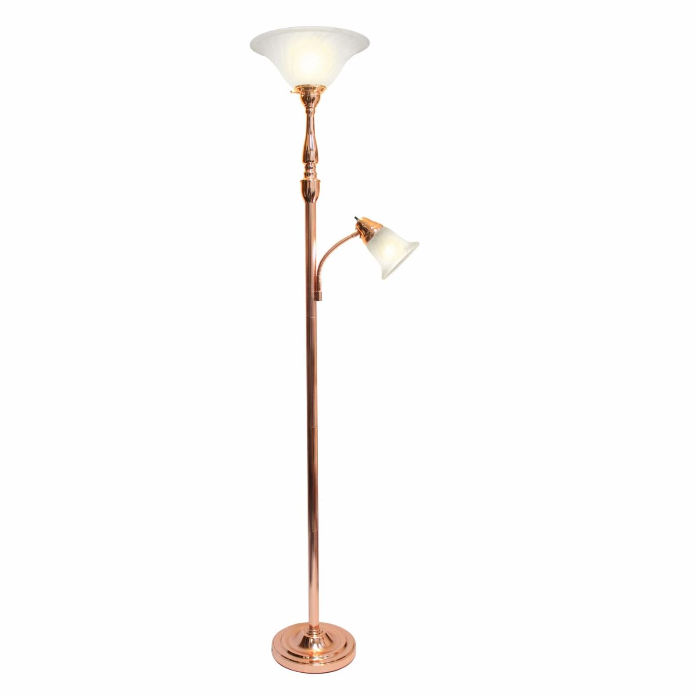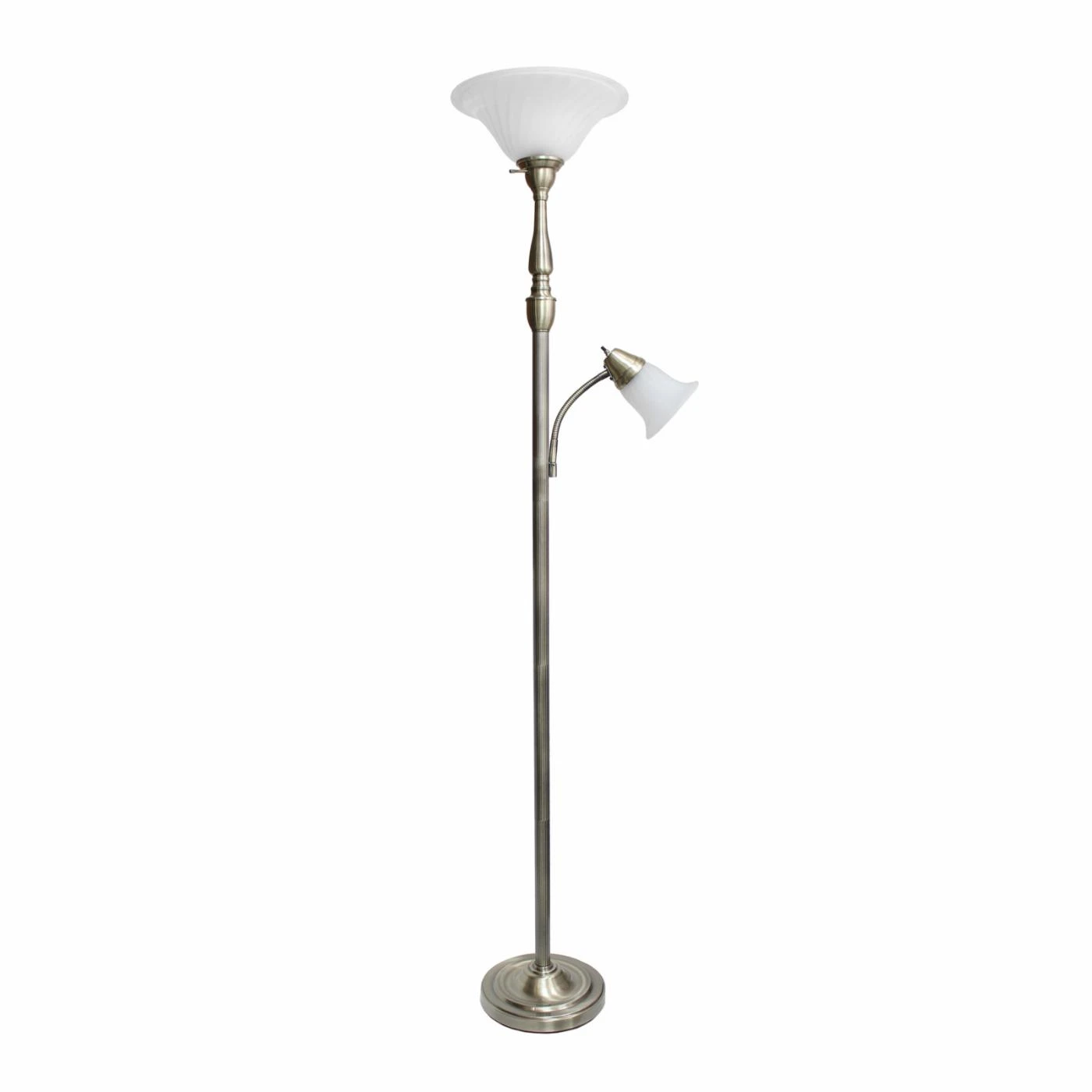 Whether you need to light up your entire space or just a good book, the Elegant Designs Mother Daughter Metal Floor Lamp will take care of it. This floor lamp has a metal base in your choice of available finishes. The flared shades are made of white marble glass to complete the traditional design. Just add one 100-watt bulb to the larger lamp and a 60-watt bulb to the smaller lamp.