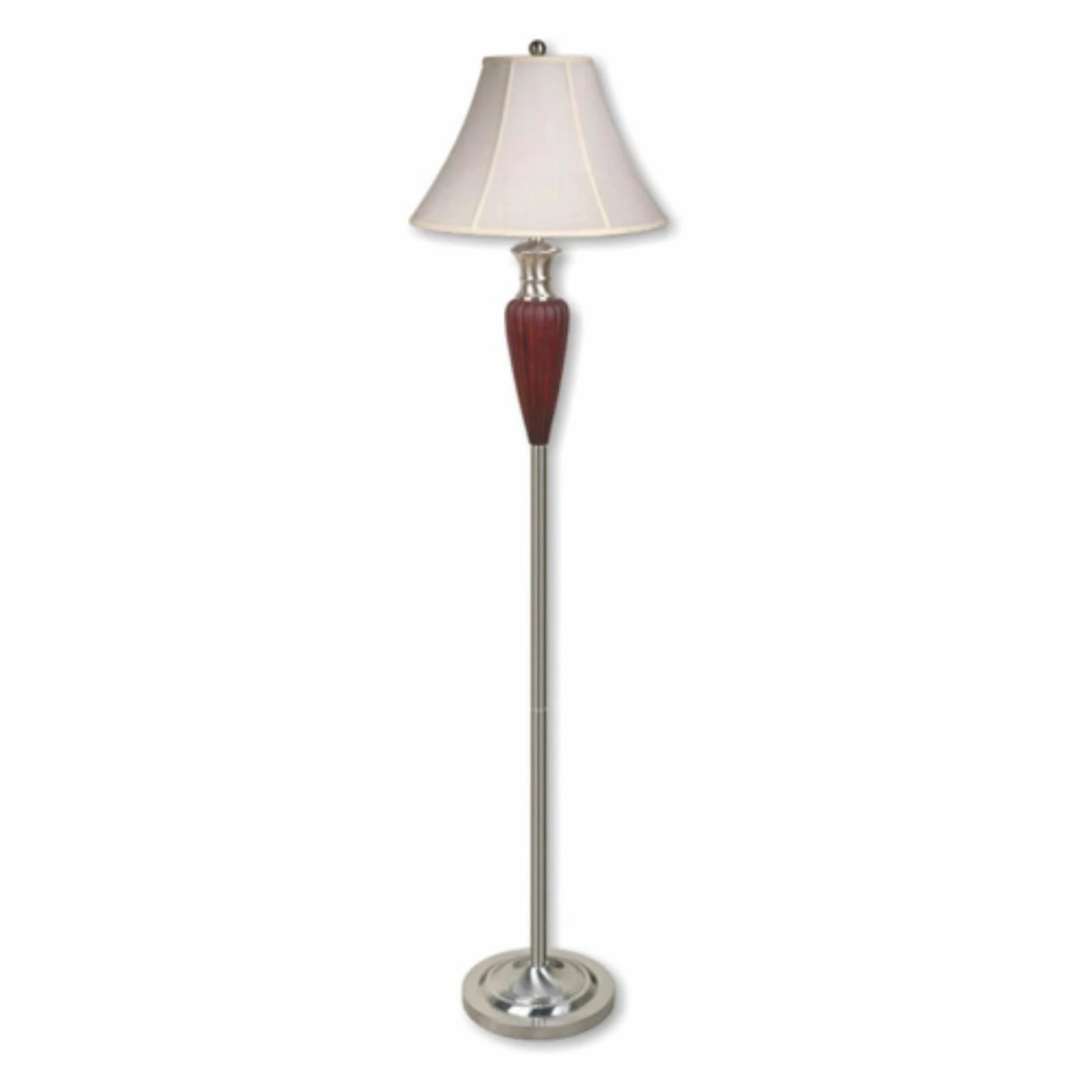 - Walnut-finished metal base, airy, graceful fabric shade