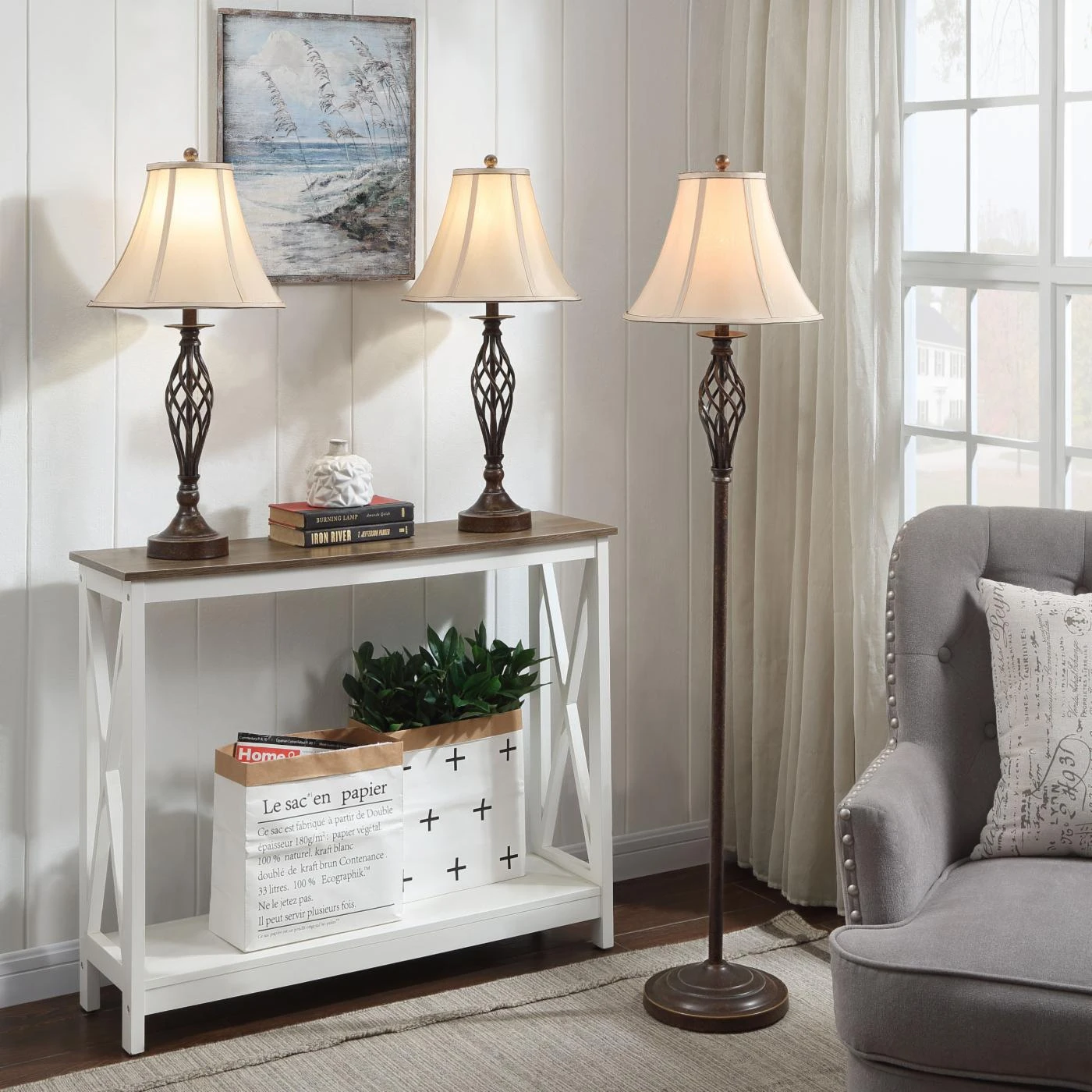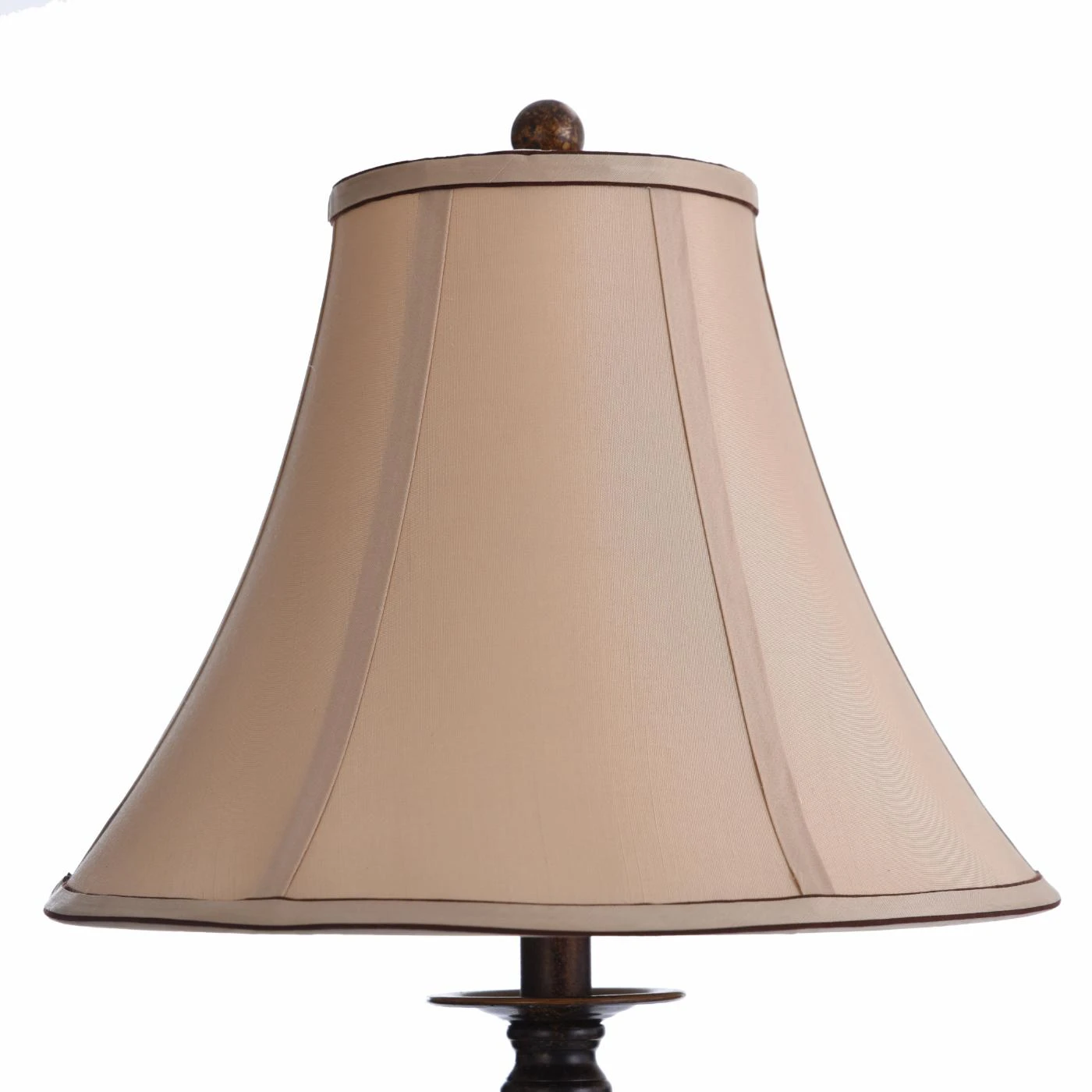 - Includes white linen bell shades