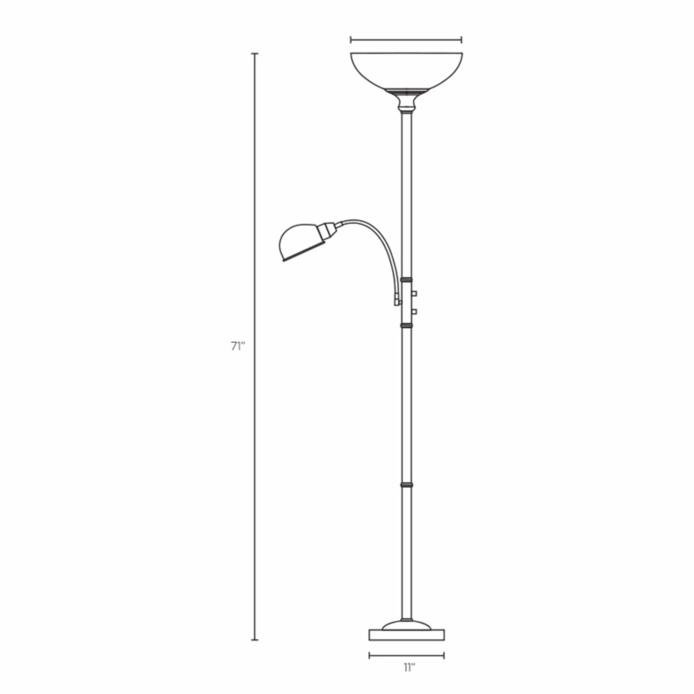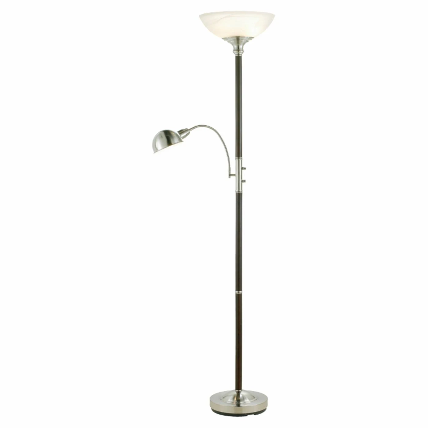 A satin steel base makes a lovely contrast with the dark walnut pole of the Adesso 4052-15 Lexington Floor Lamp. This lamp features a main light with an alabaster frosted glass shade, and a reading light with a satin steel shade. The top light takes two 150-watt bulbs (not included), and the reading light takes one 60-watt bulb (not included). The reading light is attached to a 12-inch goose-neck, allowing you to adjust it as needed. This floor lamp’s overall dimensions are 11.5 diam. x 71H inches.
