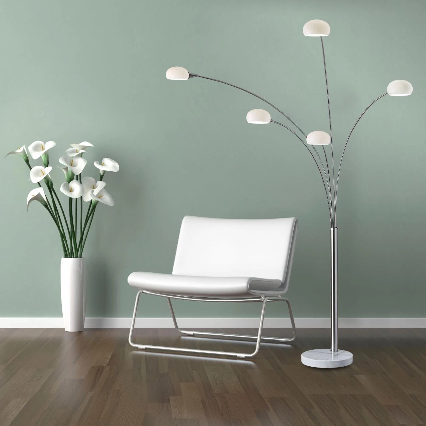 With a quirky style, the Adesso Luna Arc Floor Lamp will catch the eye of any guest. The five different lights with milky glass shades can be adjusted to fit your living space and style. With a full-range dimmer switch, this floor lamp can be adjusted to your preferred level of brightness. The five 40-watt candelabra bulbs are included with the floor lamp. With a chunky white marble base, the lamp stays firmly in place and provides a unique flair to your home.