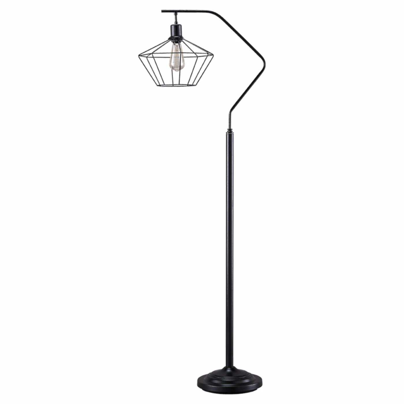 The Signature Design by Ashley Makeika Metal Floor Lamp is crafted from metal and finished in a versatile black that pairs well with any décor. The shade of this floor lamp is made from metal in a cage-like design, housing a single bulb.