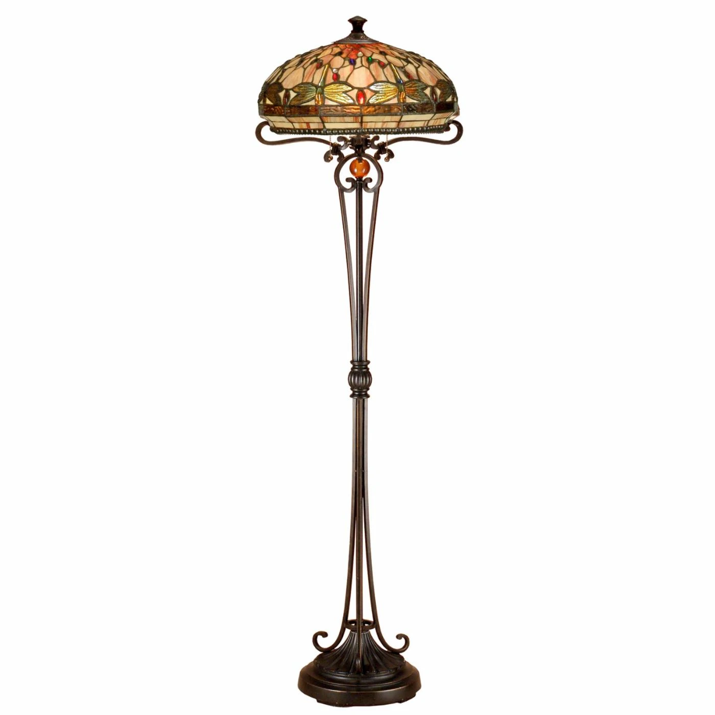 Bring traditional elegance into your space by lighting with the Dale Tiffany Briar Dragonfly Torchiere Floor Lamp. Its delicately scrolled base features an antique bronze finish. Hand-rolled Tiffany art glass creates its shade with dragonfly motif. This floor lamp requires two 100-watt bulbs (not included).