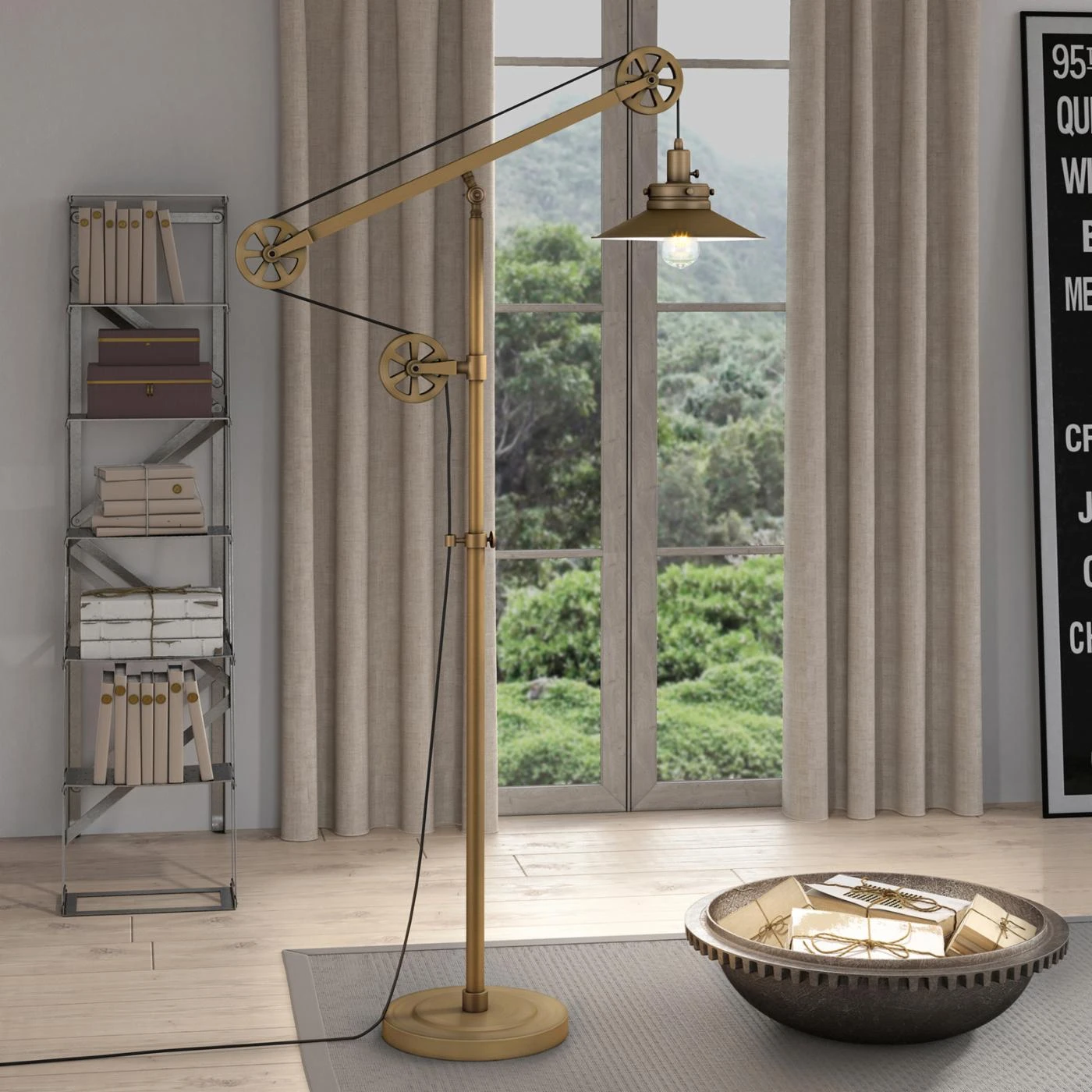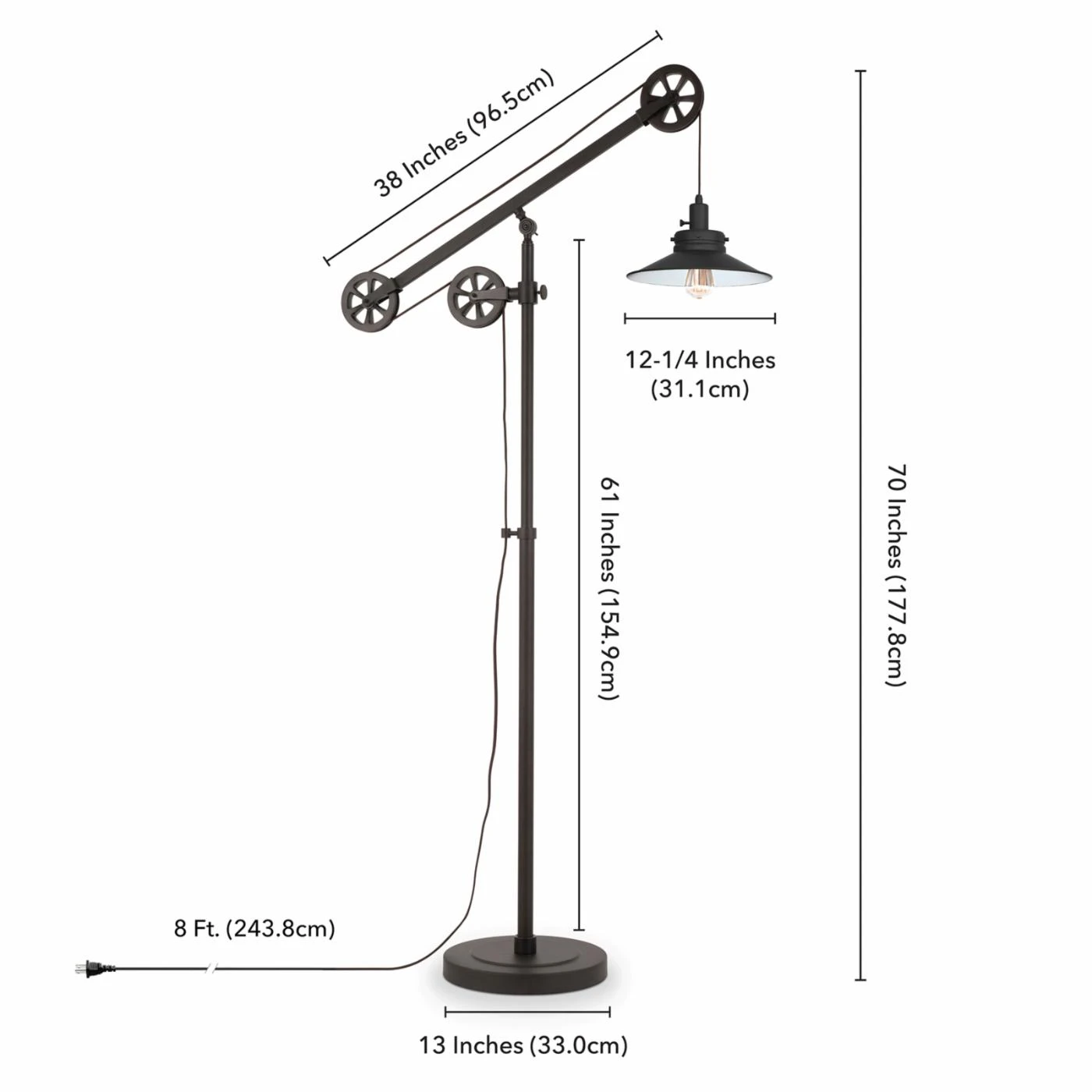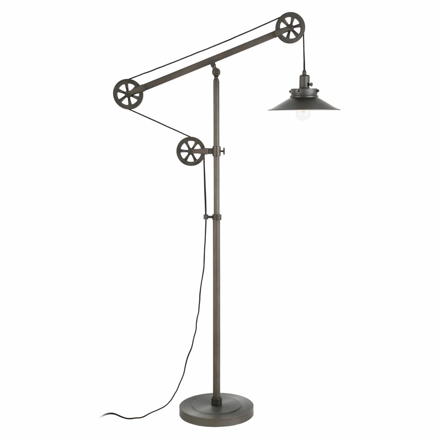 If you love industrial flair, make room for the Hudson & Canal Descartes Wide Brim Floor Lamp. This playful, inventive floor lamp features a pulley-inspired design, so you can adjust it to best suit your space. Place it near your favorite reading chair or in the corner of your study. This lamp comes with an E26-base and supports the following bulbs: 40W Type A, 13W self-ballasted, or 9W SB LED.