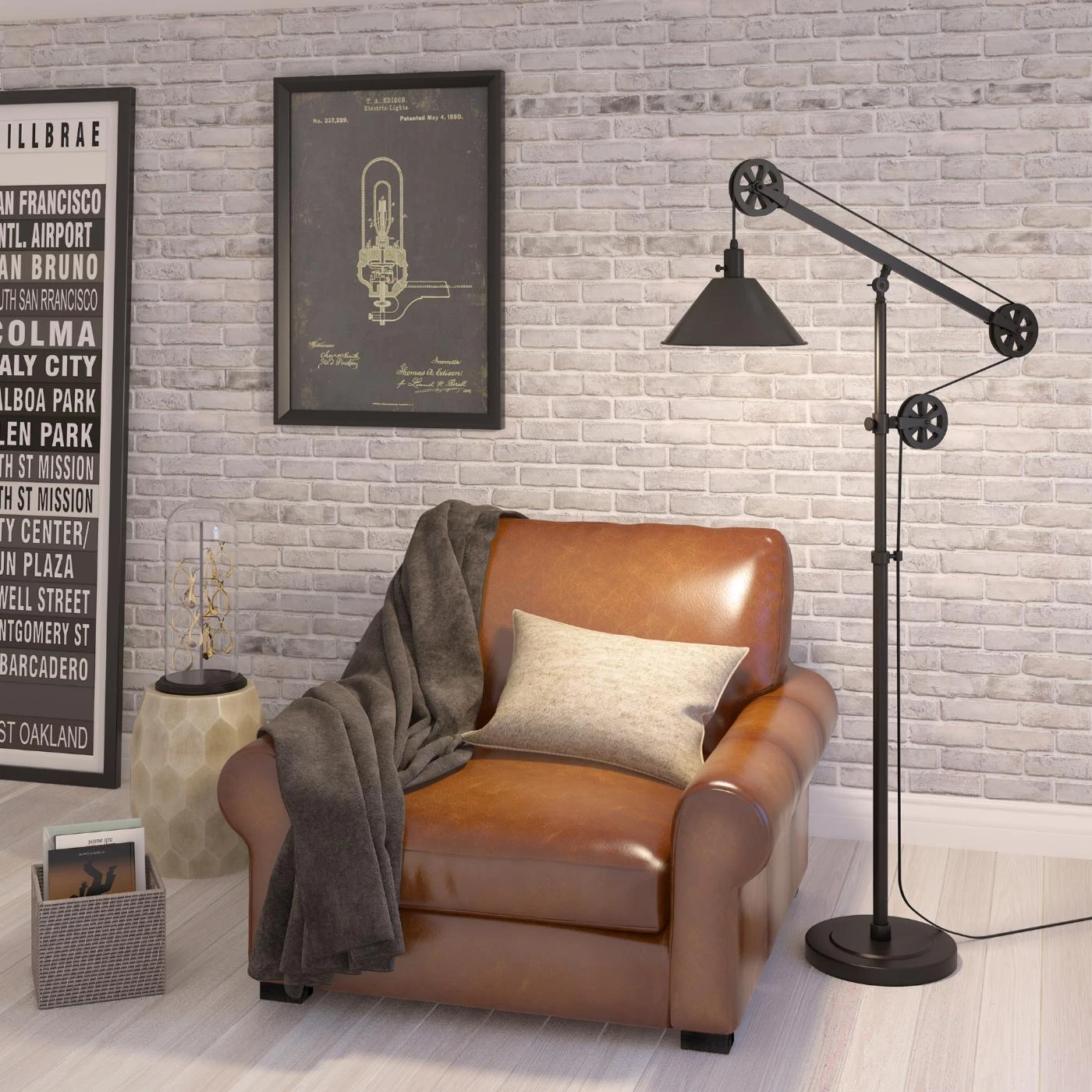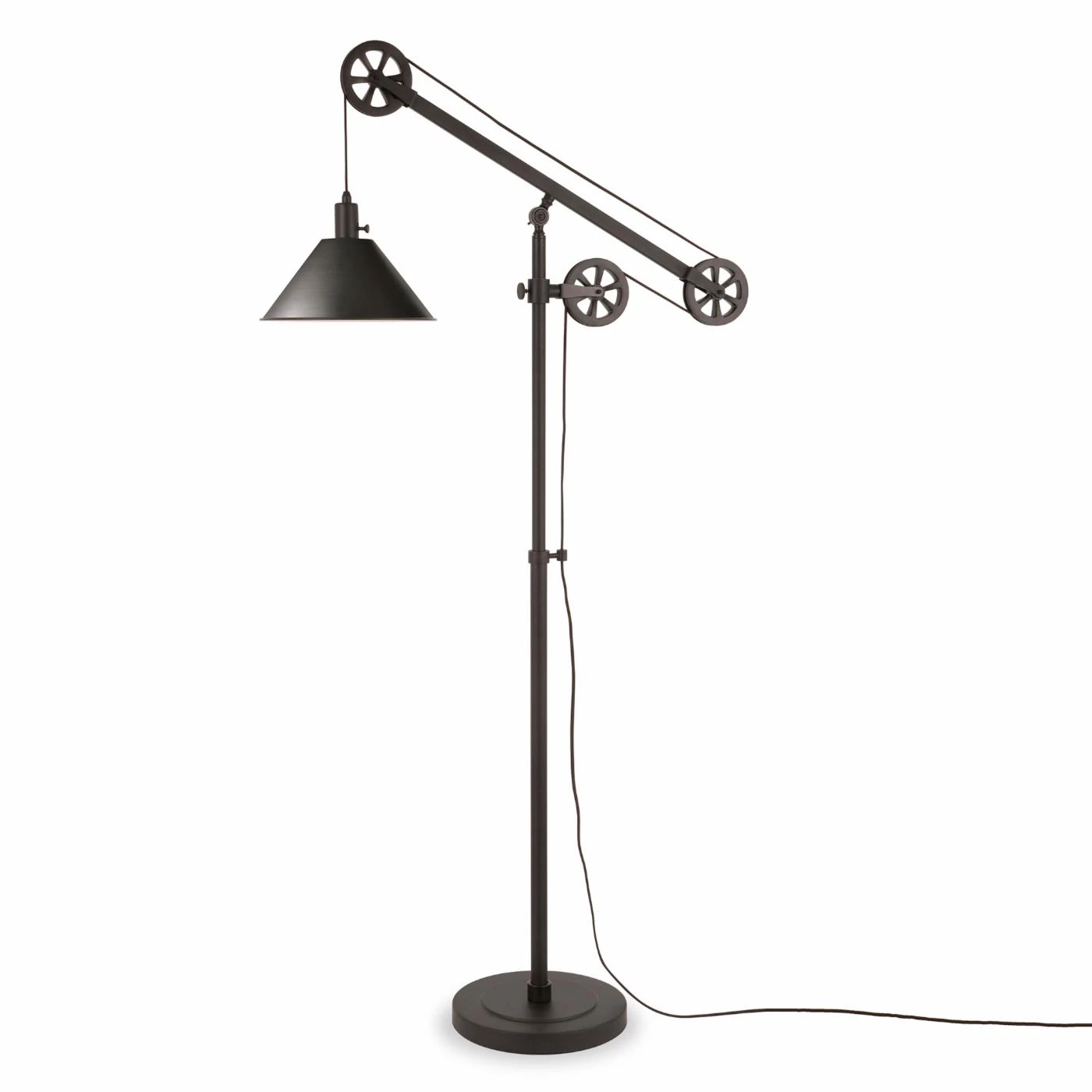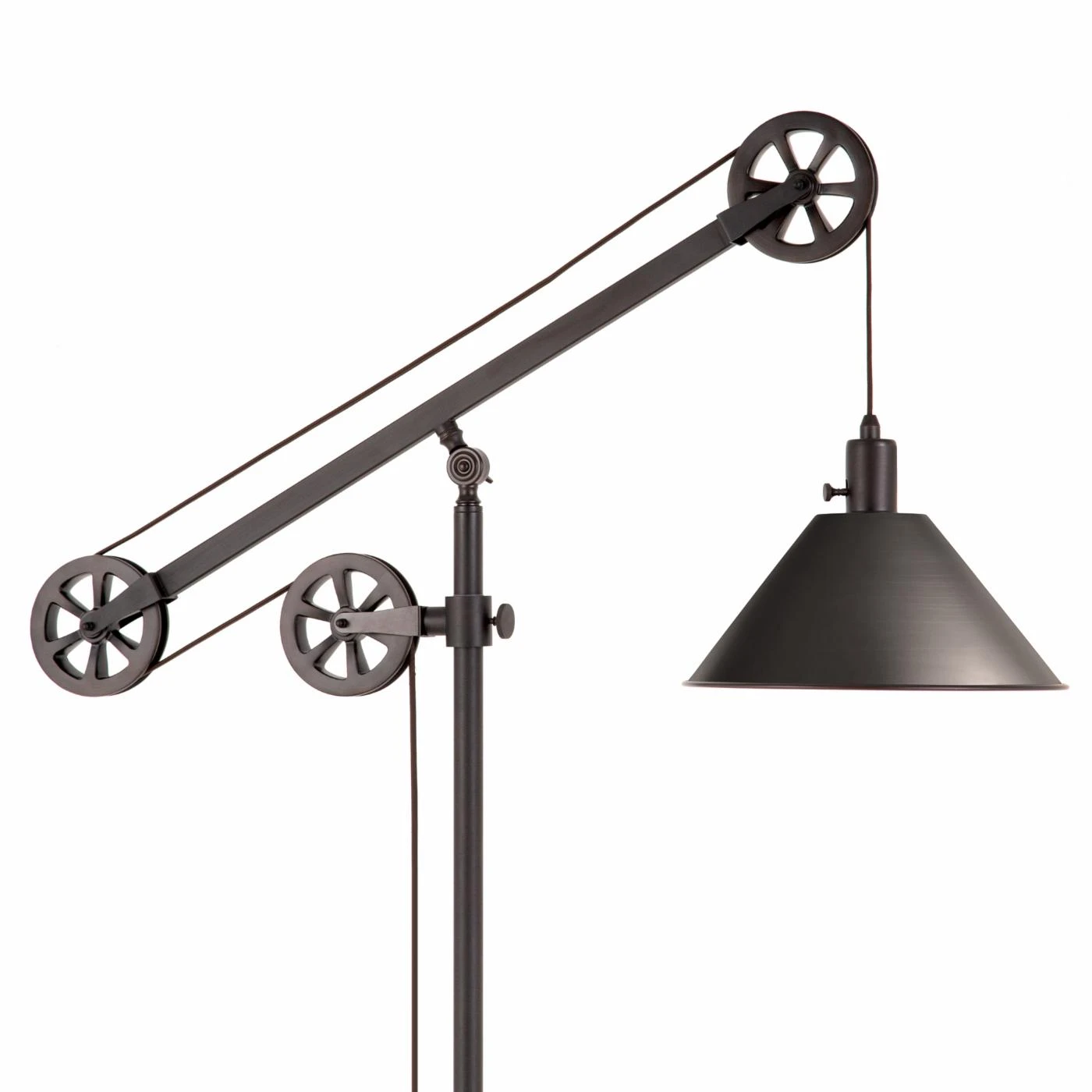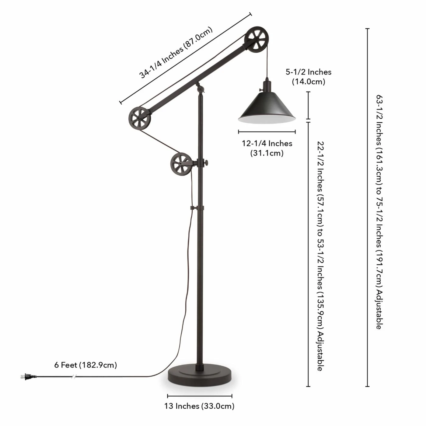 Raise or lower the Hudson & Canal Descartes Floor Lamp with the industrial-style pulley system to direct light right where you need it. This floor lamp is made of metal in a blackened bronze finish. It features a bell-shaped shade. Turn the light on and off with the foot switch. Add a 100W E26-base bulb and plug in the 6-foot cord for operation.
