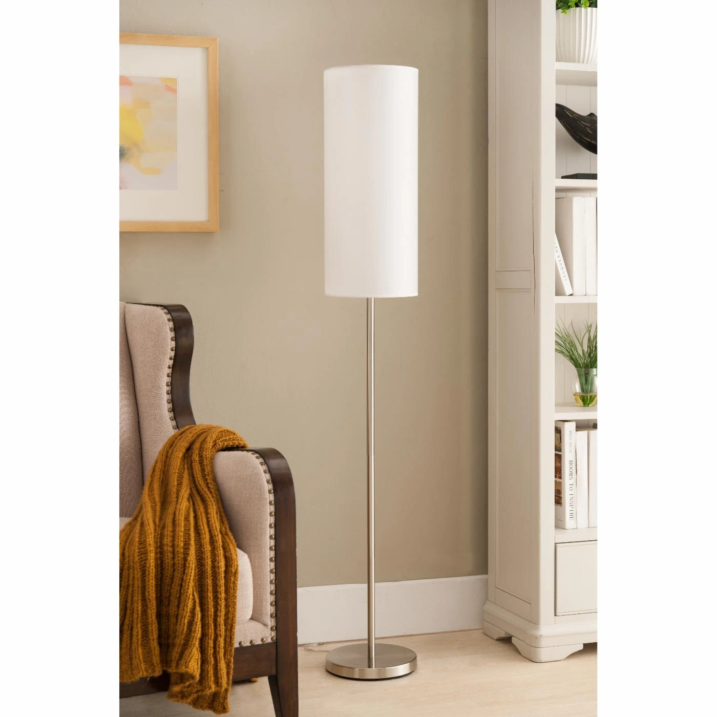 The striking K&B Furniture L229 Brushed Nickel and White Floor Lamp features an elongated white fabric drum shade sure to light up your room. Its sleek base in brushed nickel enhances the contemporary design of this floor lamp. It requires one type A 100-watt light bulb, not included.