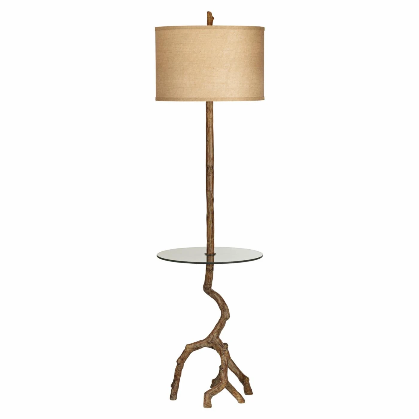 The Pacific Coast Lighting Beachwood Floor Lamp offers a distinctive blend of rustic charm and modern minimalism. Deftly crafted of durable resin and tempered glass, this contemporary floor lamp is inspired by the rugged curves and unpolished grain of natural driftwood. Complemented by a fabric drum shade in toasted beige, this versatile piece features a slim glass end table to rest your book or glass of wine. This rugged floor lamp features a socket/rotary on/off switch and requires one 150-watt medium base bulb, which is not included.