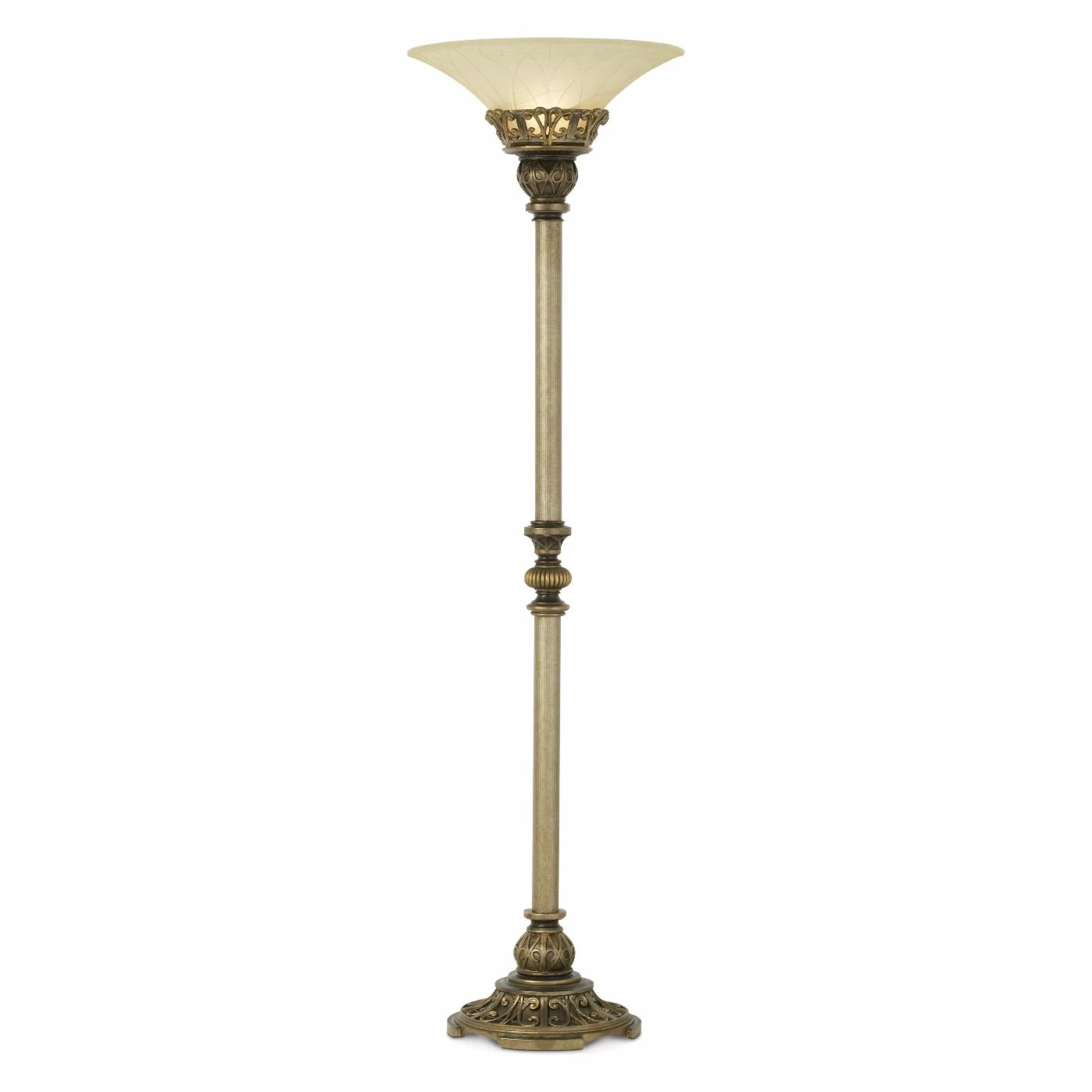 Filigree details and an Applewood finish with a subtle sheen gives the Pacific Coast Lighting Kathy Ireland First Lady Timeless Elegance Torchiere Lamp its classic beauty. A flared glass bowl shade directs light up, offering a bright, diffused glow throughout the room. This torchiere lamp requires one 150-watt incandescent bulb.