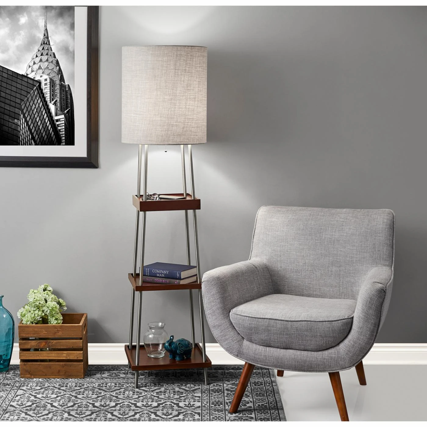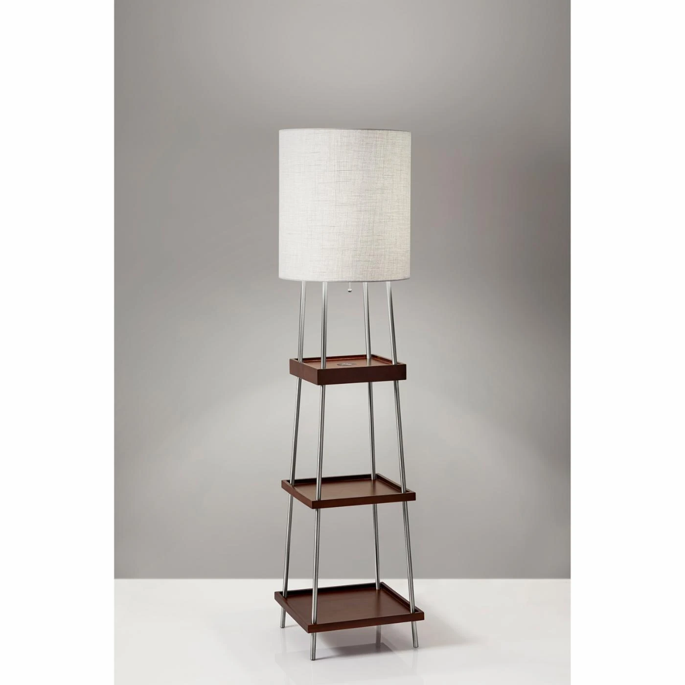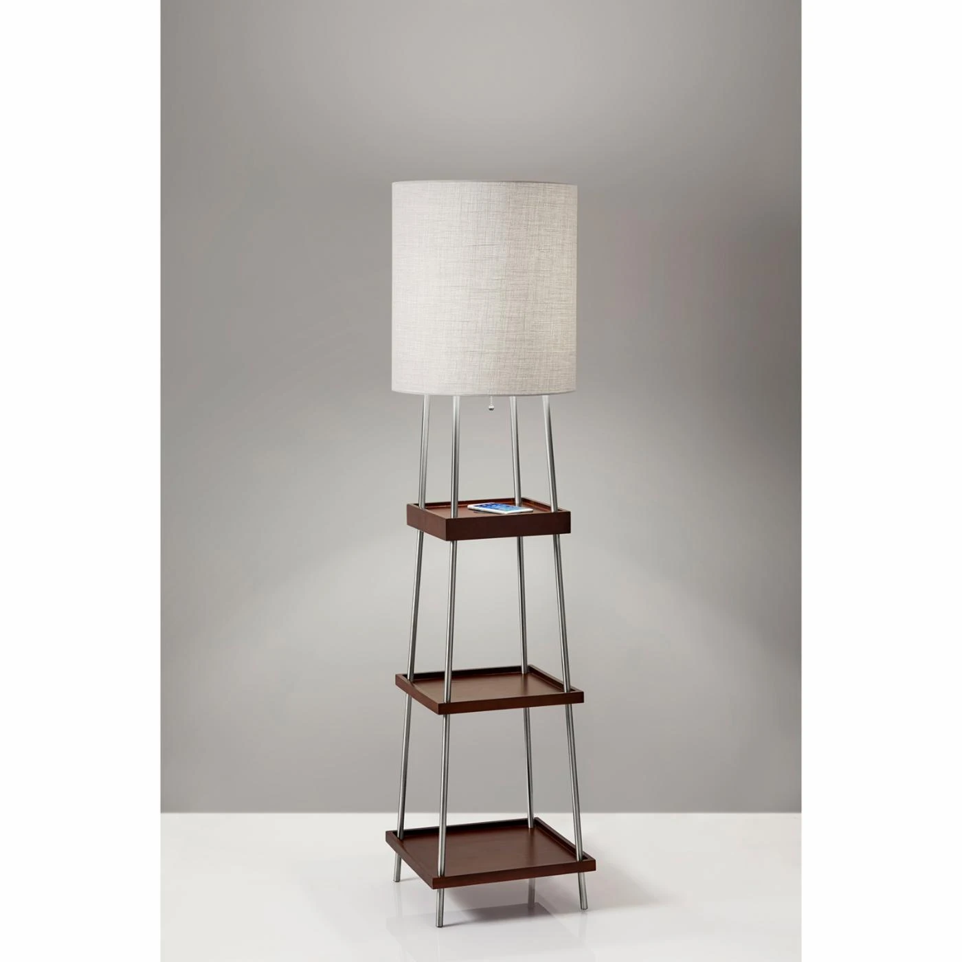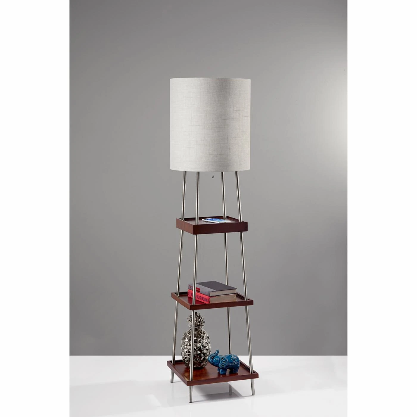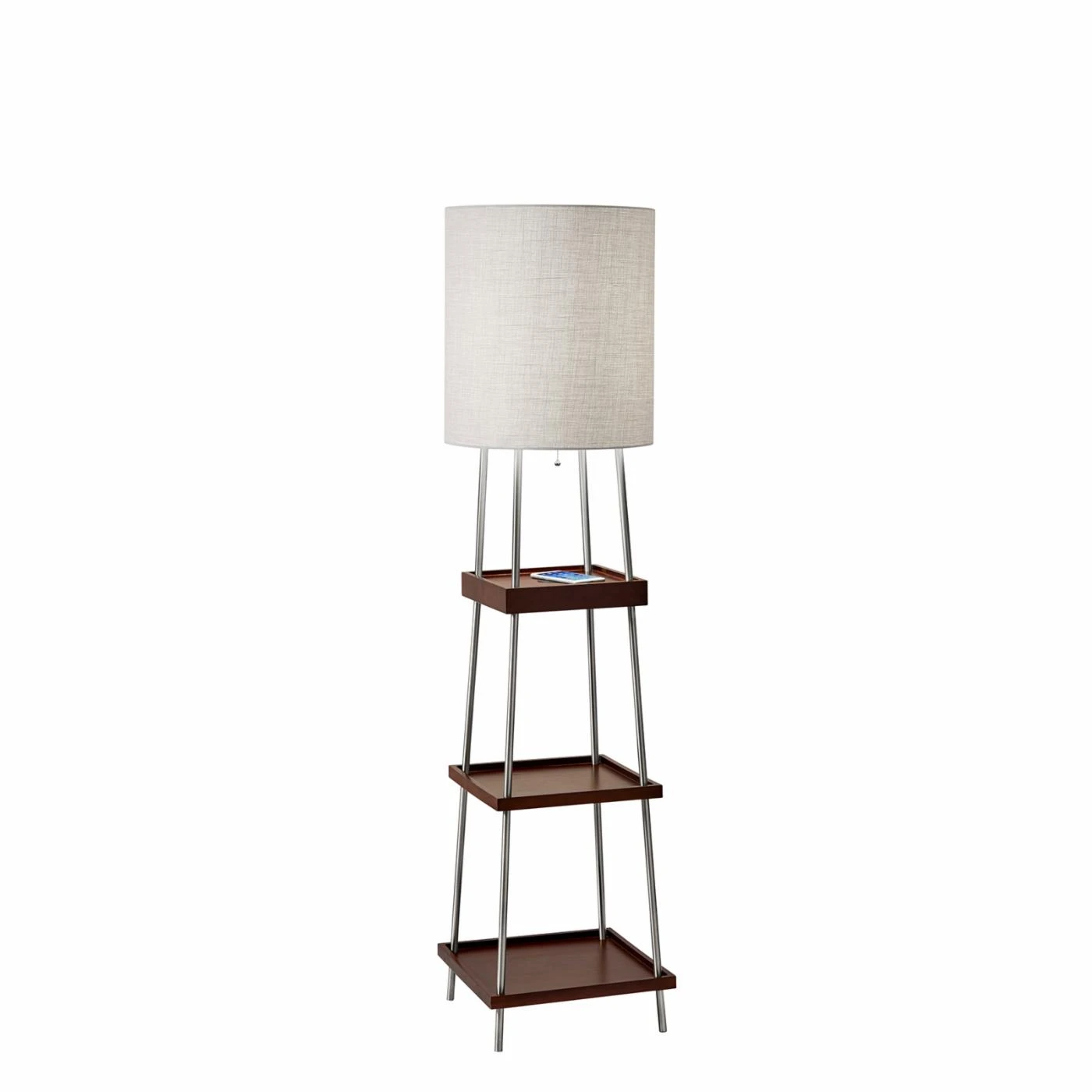 Equipped with a USB port and integrated charging pad, the Adesso Henry Shelf Floor Lamp with Charging Pad lends function and beauty to your home office or living space. This floor lamp is outfitted with three tiers of shelving, giving you room to display decor and framed photos or stash magazines and TV remotes. This floor lamp is illuminated by a single bulb and offers pull-chain operation. The long cord of this floor lamp allows you the option of placing it near or away from a power outlet.