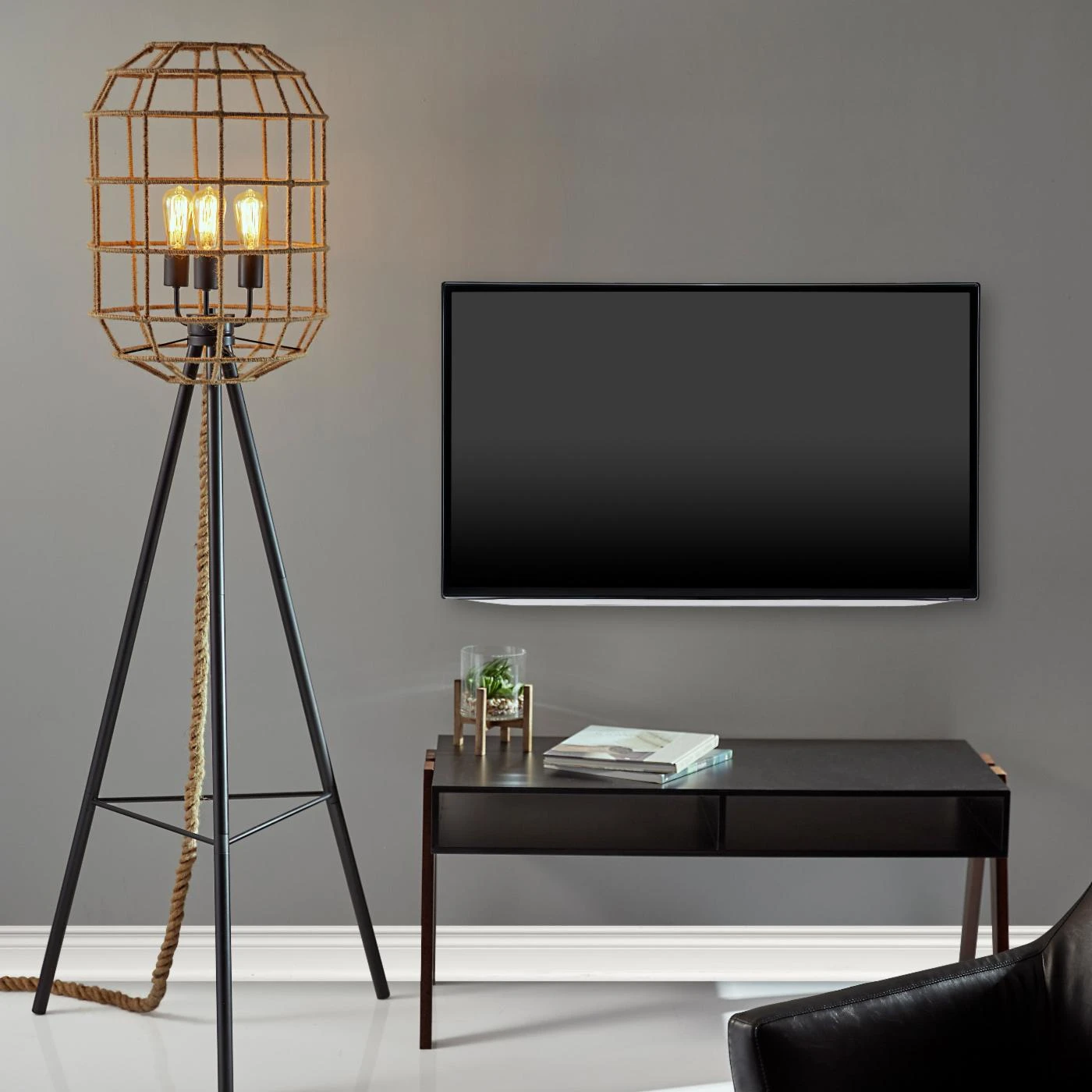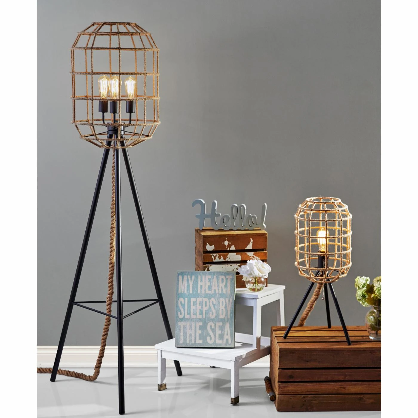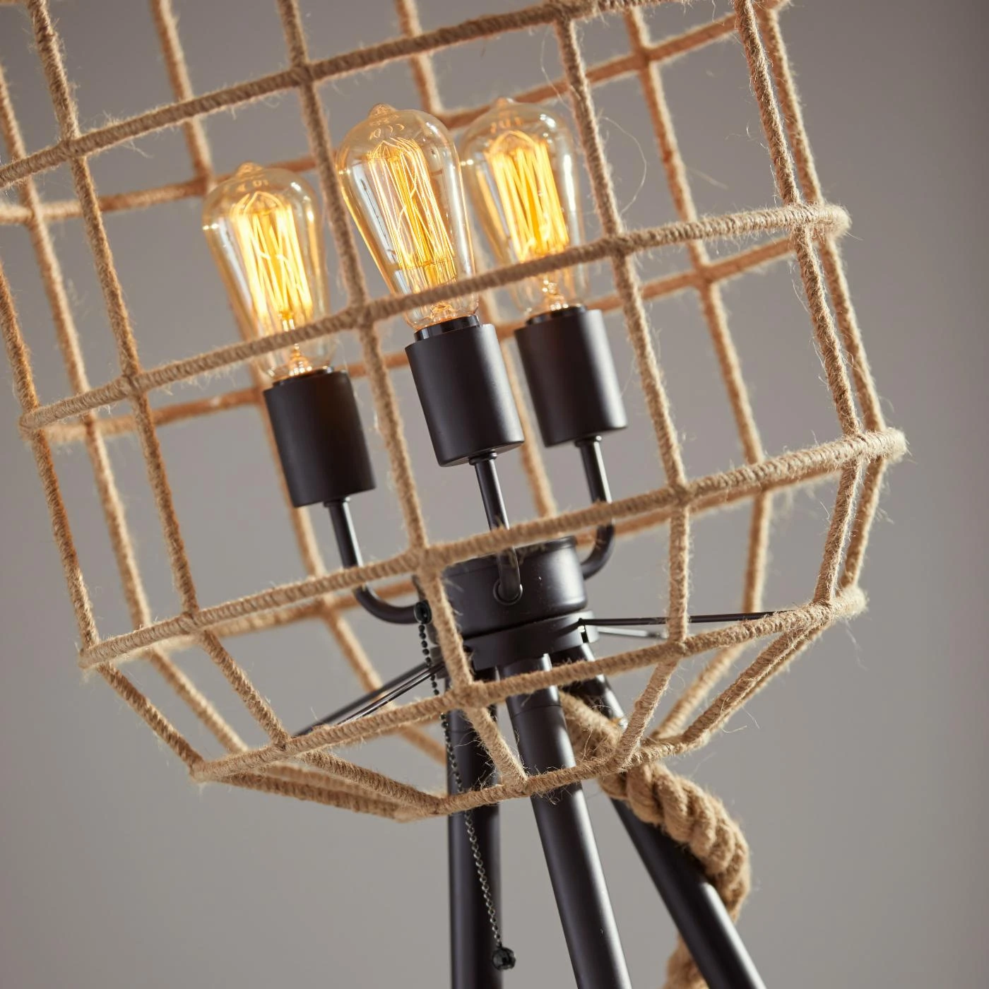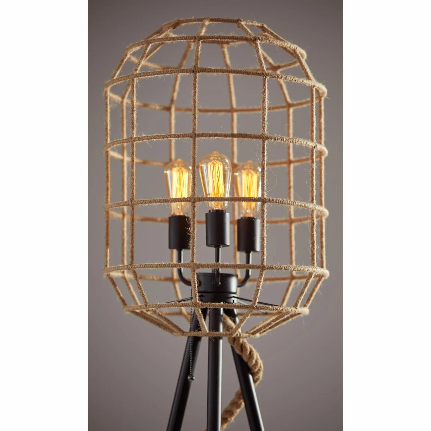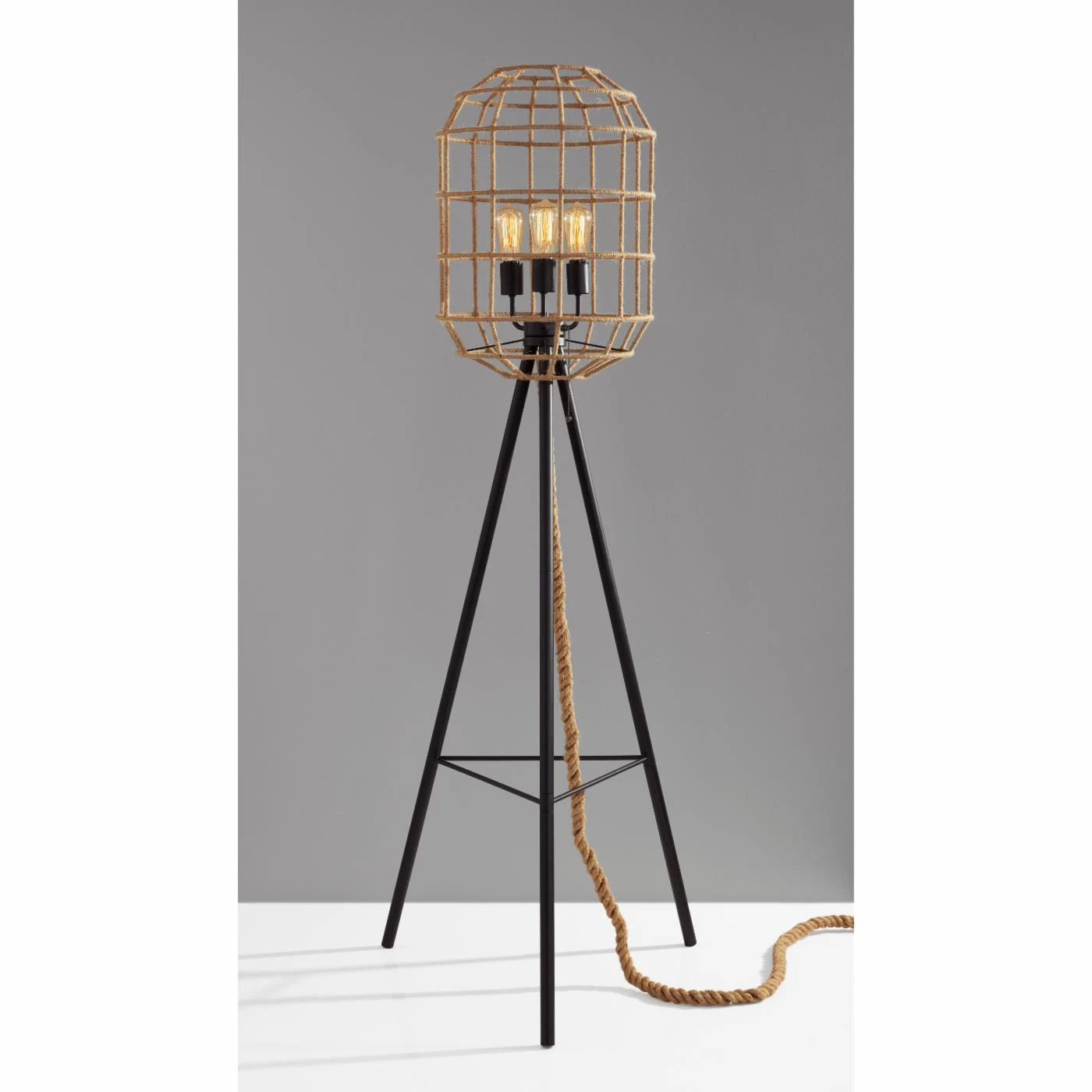 From its tripod base to its cage shade, the Adesso Montauk Floor Lamp brims with designer style. This captivating floor lamp features four-way pull chain operation and comes with its three 60-watt vintage bulbs. Its metal base features a versatile black finish, while its rope-crafted shade is adorned with a light brown hue.