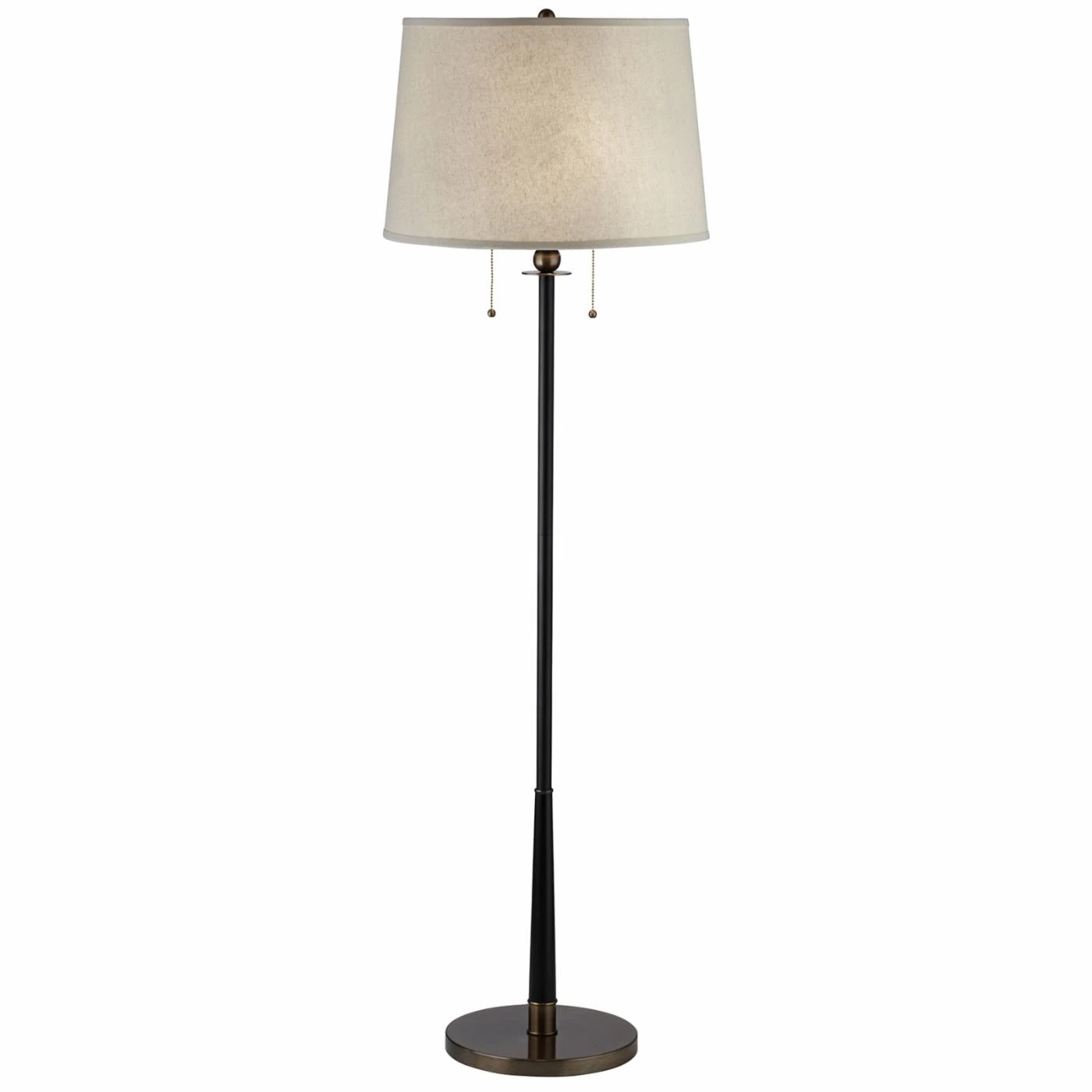 Perfect for lighting your home or office, this Kathy Ireland City Heights Floor Lamp is graced with an understated elegance. Its black metal base features bronze accents and is capped by a beige fabric drum shade. This floor lamp requires two 100-watt bulbs, not included.