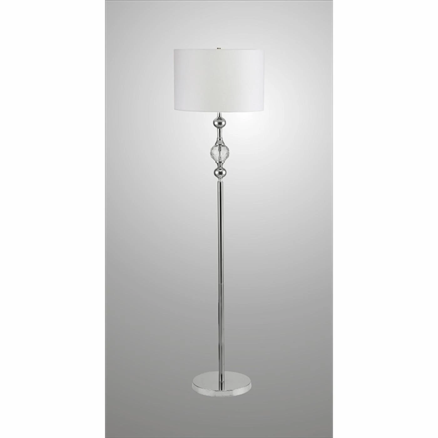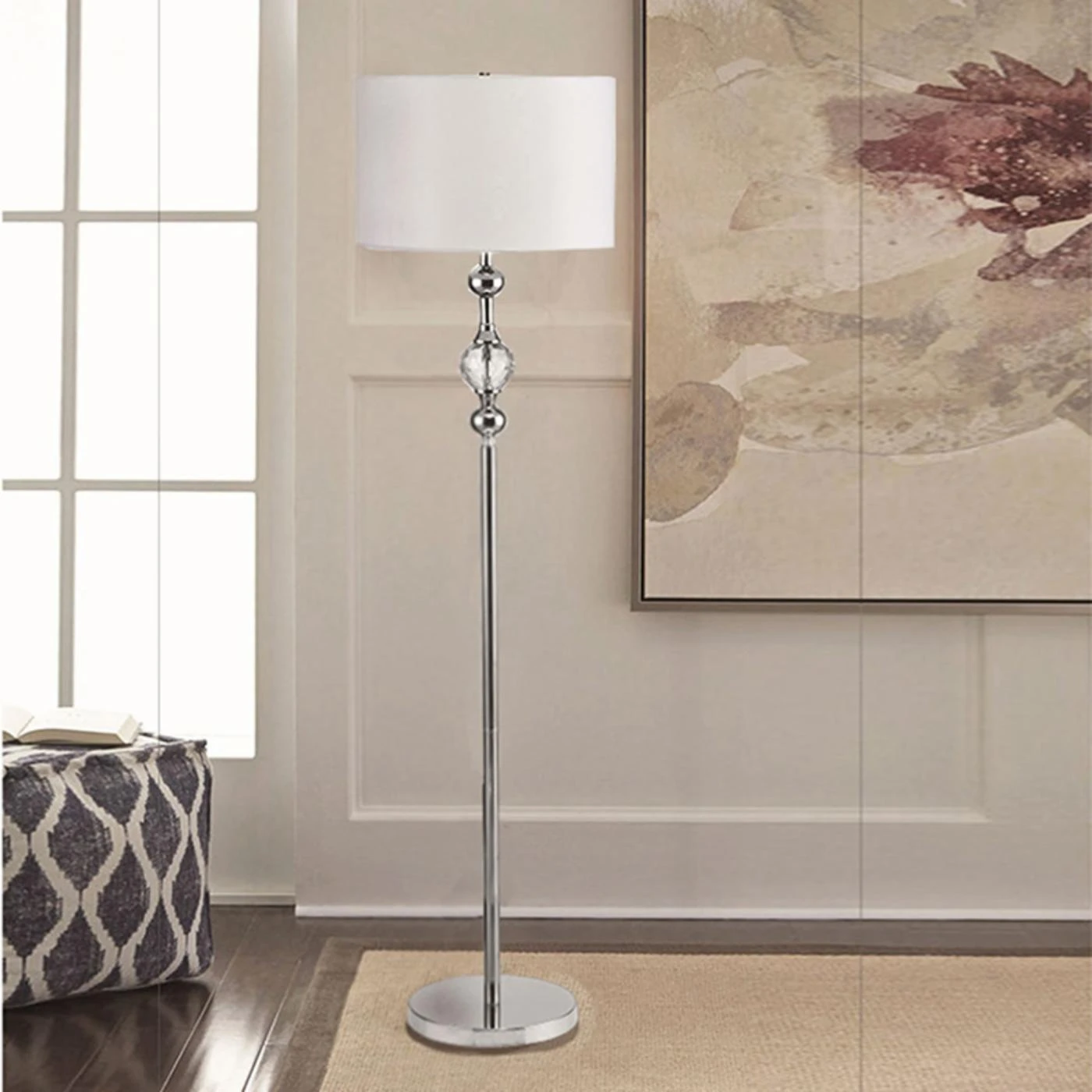 Glamorous and modern, the Ore International Leona Floor Lamp features a sleek chrome-colored metal frame with a glittering accent crystal. The shade boasts a contemporary dome shape crafted from white linen to gently filter light. This floor lamp includes pull-chain operation as well as an LED feature for energy efficiency.