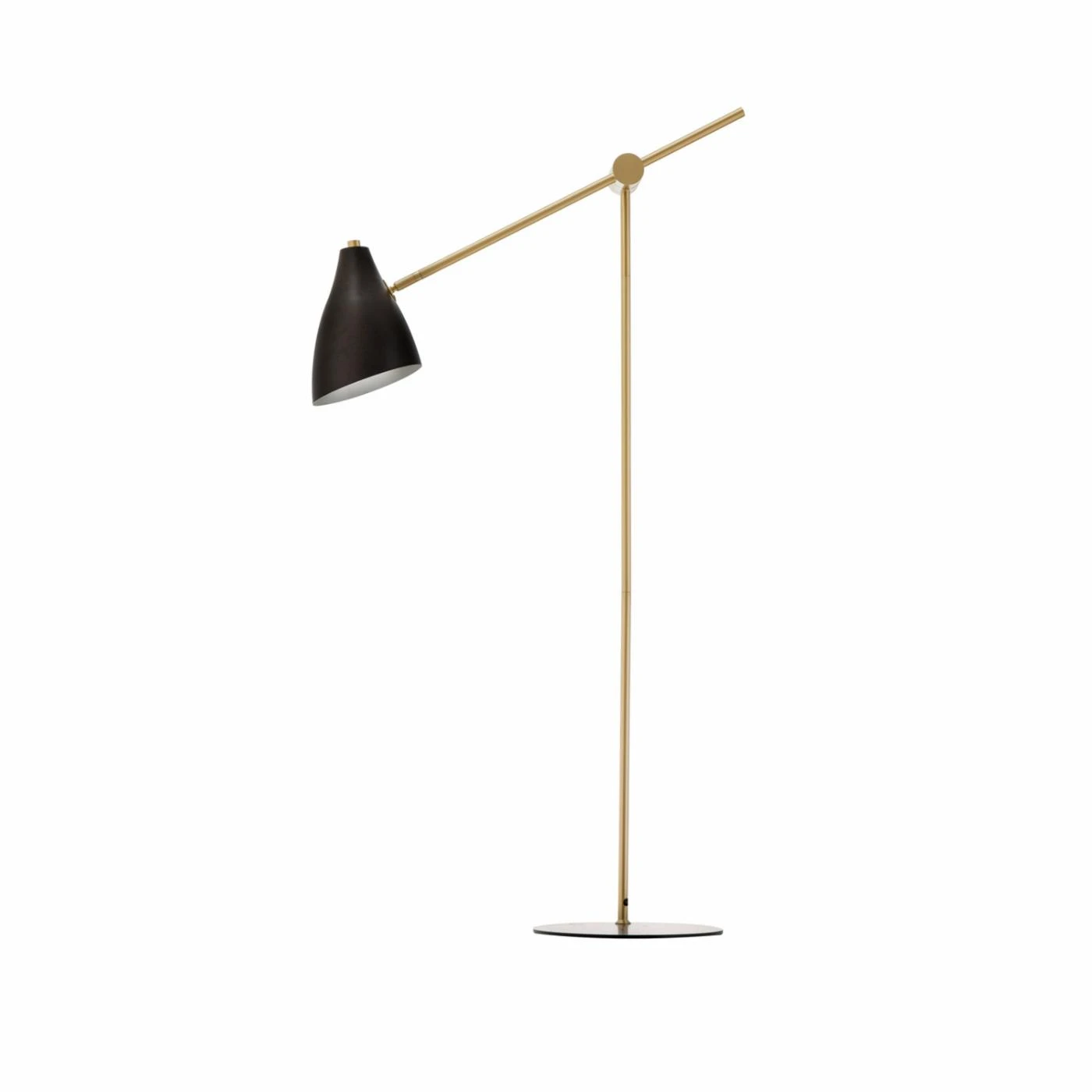 - Matte black shade and brass adjustable base