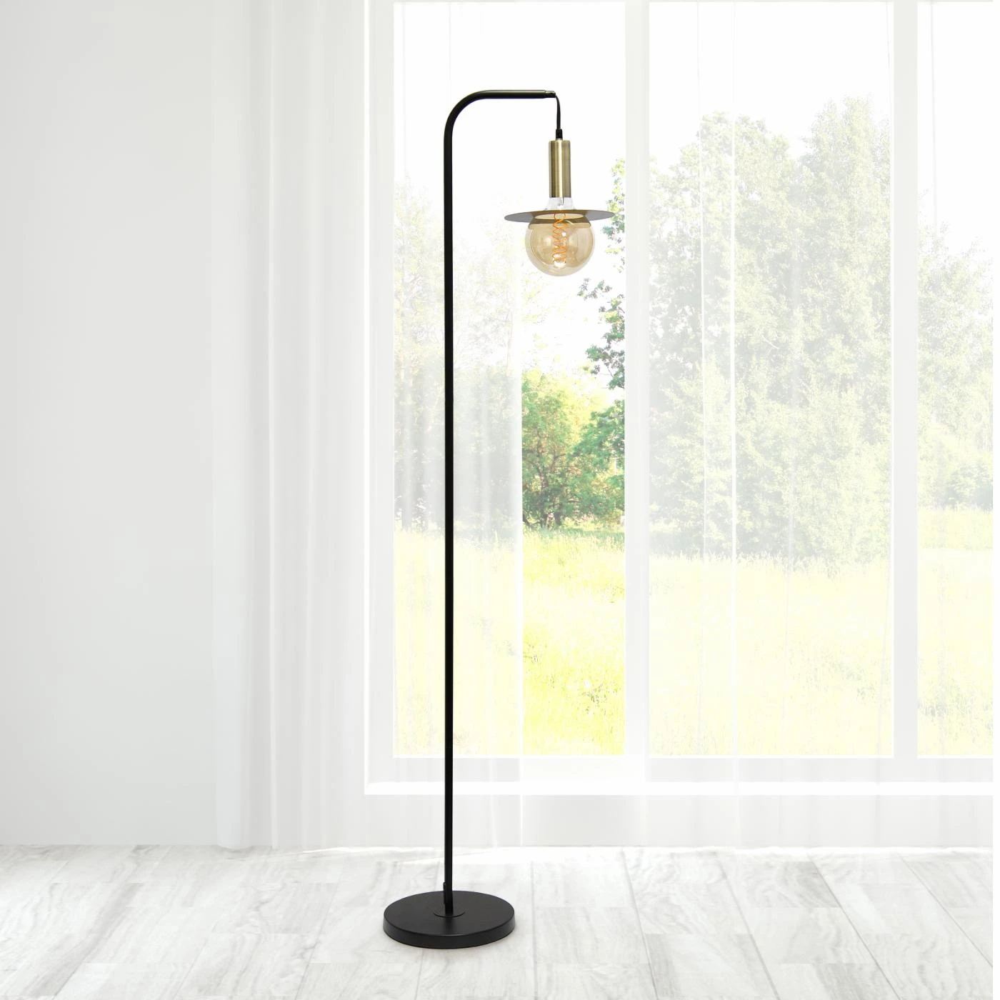 Brighten up your living space with this attractive street light style floor lamp. It features a matte black finish complemented with sleek antique brass accents. Add a modern, industrial touch to any room in your home! Ideal for your foyer, living room, bedroom, office or library.
