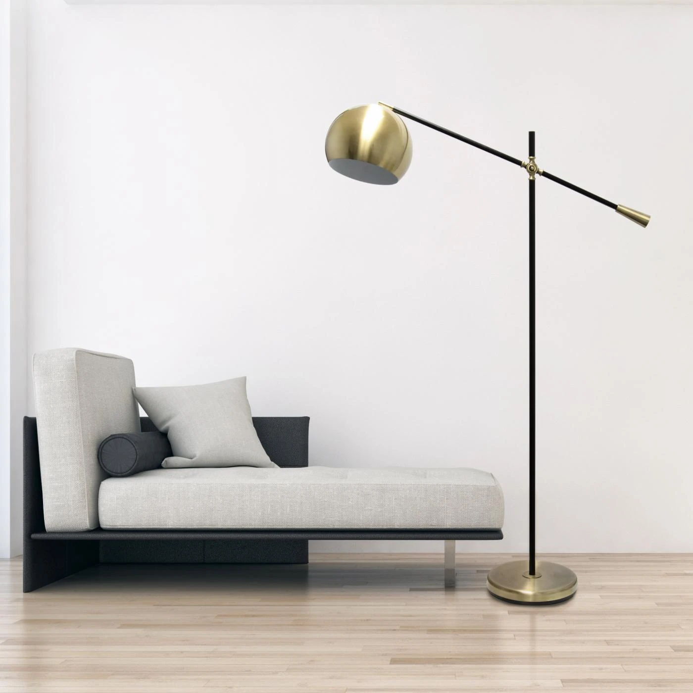 Brighten up your living space with this attractive piece, accented with matte black poles and polished antique brass metal. This minimalist floor lamp features clean lines and a stylish metal dome shade. Add sophistication to your living room, bedroom, office or library with this sleek and modern floor lamp.