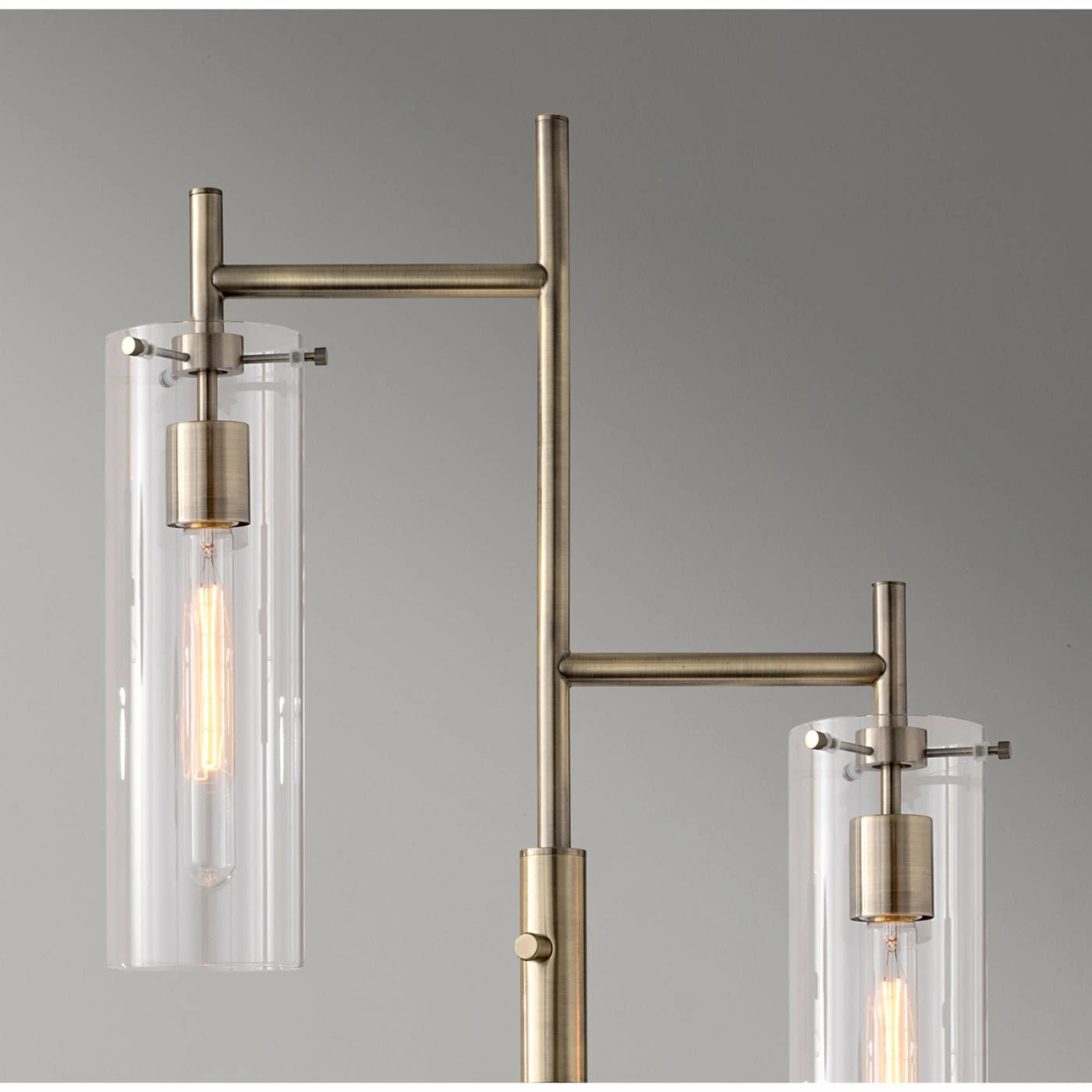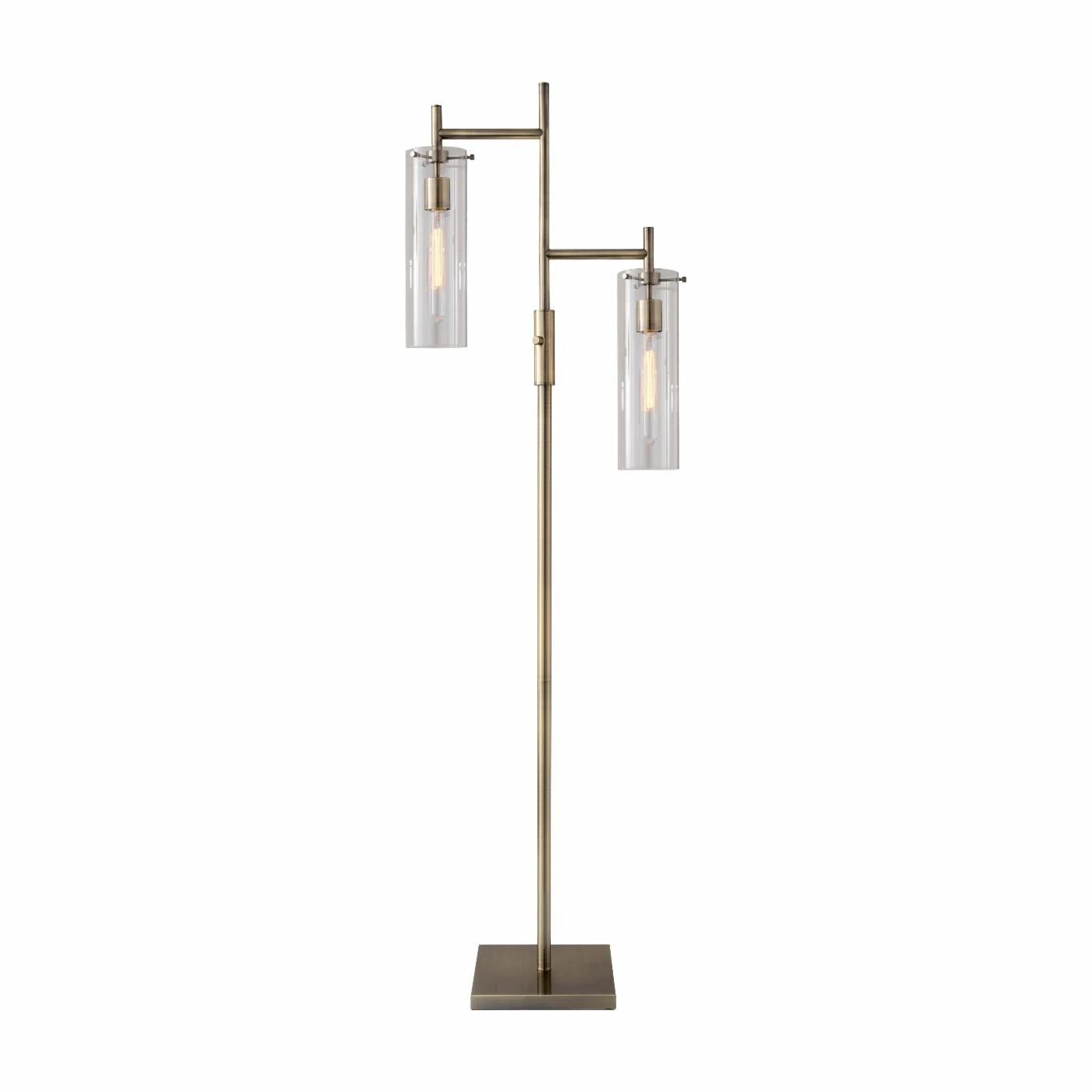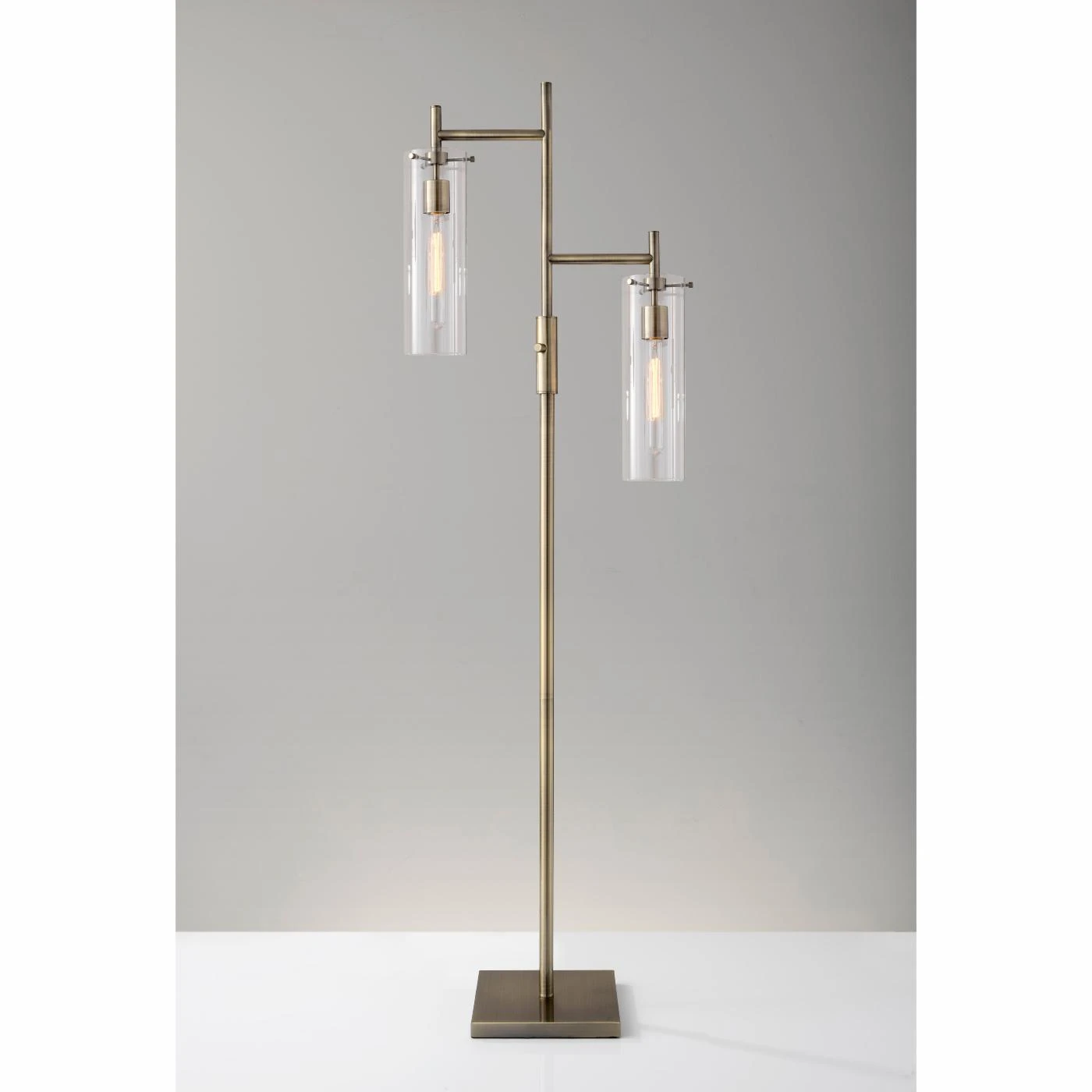 Outfitted with two clear glass shades in a tall, cylindrical design, the Adesso Dalton Floor Lamp lends a stately accent to your home’s look. Crafted from metal, this floor lamp showcases an antique brass finish that accentuates its elegant design. This floor lamp is rounded out by a traditional rotary-style power switch, and it has an extra-long power cord so you can place it in areas away from power outlets.