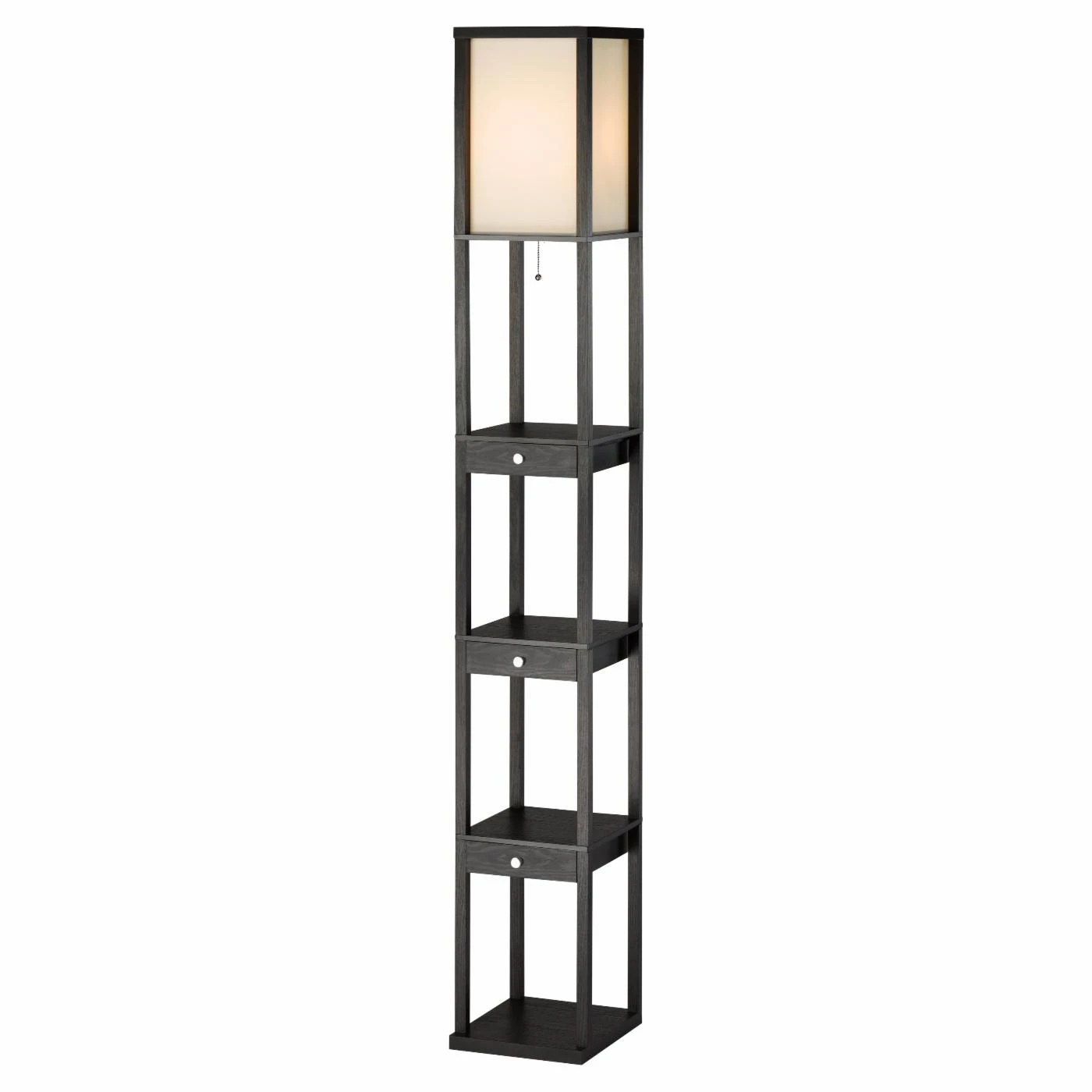 you expect light from your lamps, and it would be nice if they looked good too, but the Adesso Murray 3450 Three Drawer Shelf Lamp – Black feels that it can provide all that and a bit more. Crafted from rugged, non-warping MDF with a veneered exterior, this tall floor lamp offers three pull-out drawers that give you the perfect place to store smaller items. Each drawer pulls out smoothly and sports chromed hardware. The standard pull-chain activates a 150-watt incandescent or equivalent bulb behind the linen-hued fabric shade.