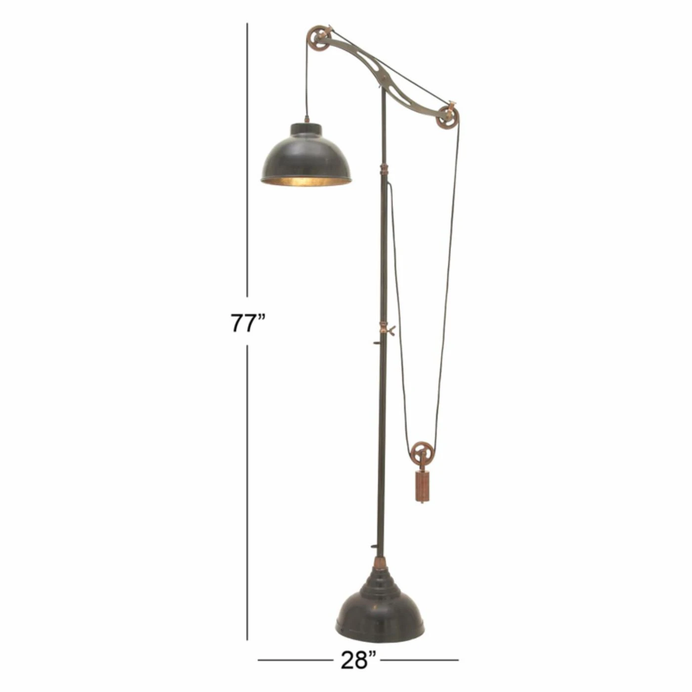 The DecMode 24515 Floor Pully Lamp features a unique pulley system that adds a vintage touch to this lamp. A round dome shade accents the light source. Its neutral finish complements many décor styles, allowing this lamp to coordinate with your home design.
