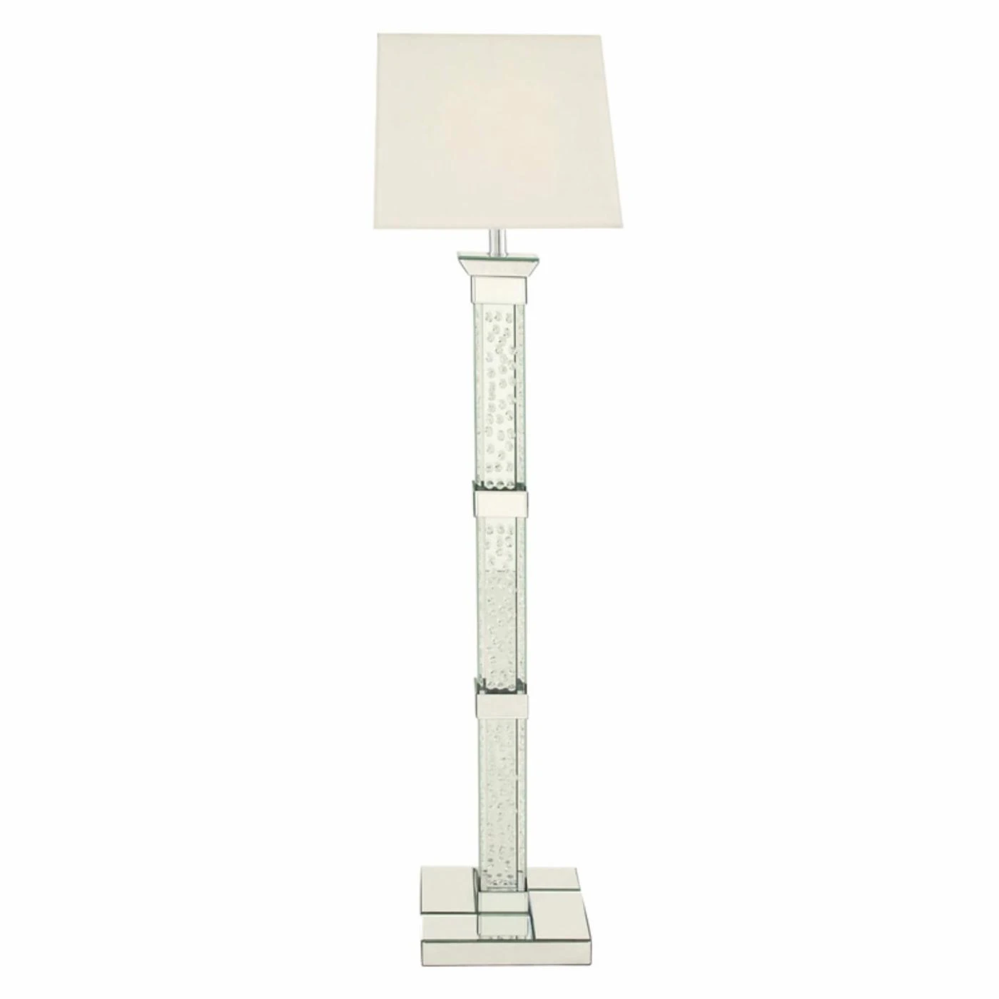 The DecMode 79290 Floor Lamp features a tiered tile base that stands out. Clean lines add a modern touch to this lamp. It includes a sturdy mirrored square base and a coordinating square shade.