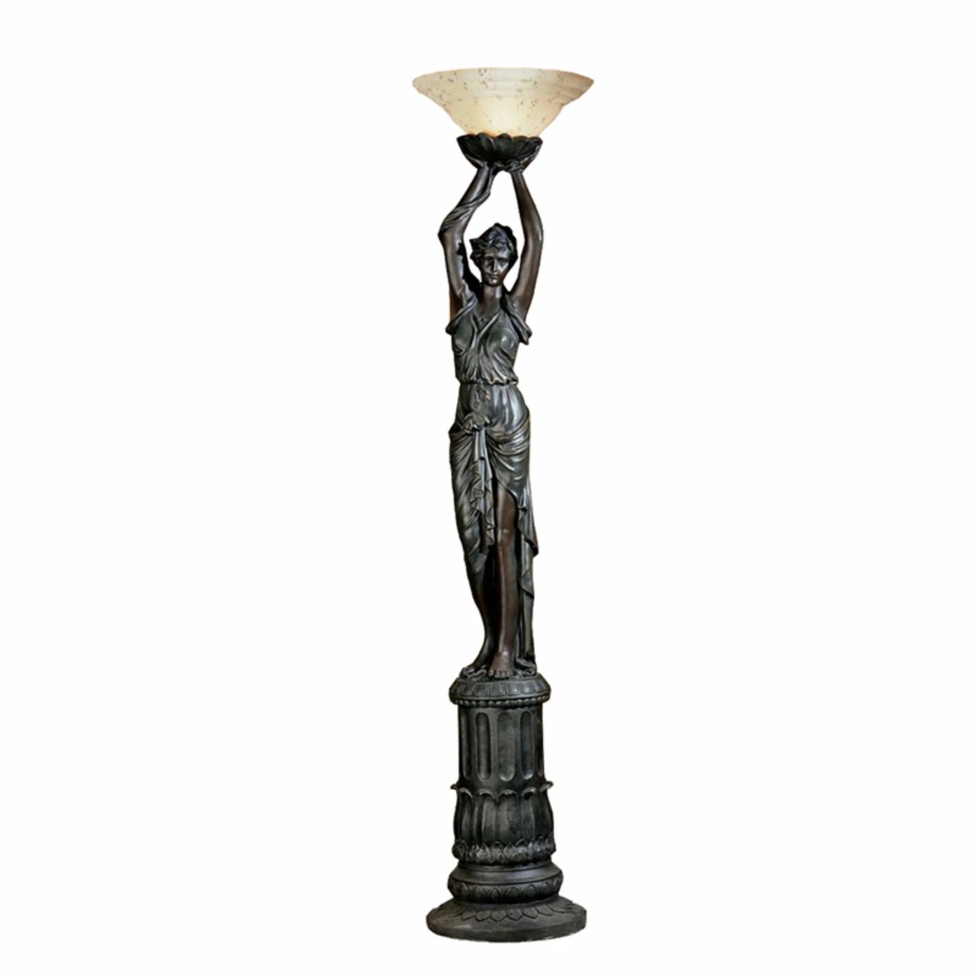 The Design Toscano Place de La Etoile Torchiere Lamp blends touches of architecture, art, and classic glamour in a piece that will be perfectly at home in your space. This extra-large floor lamp features a robed woman holding aloft a shade of frosted, cream-colored glass. A Roman-style pillar creates a base that’s both classic and stable. The body is made from designer-quality resin with a hand-applied finish of antique bronze. A single incandescent bulb illuminates the frosted shade, and a simple foot-switch makes it easy to activate.