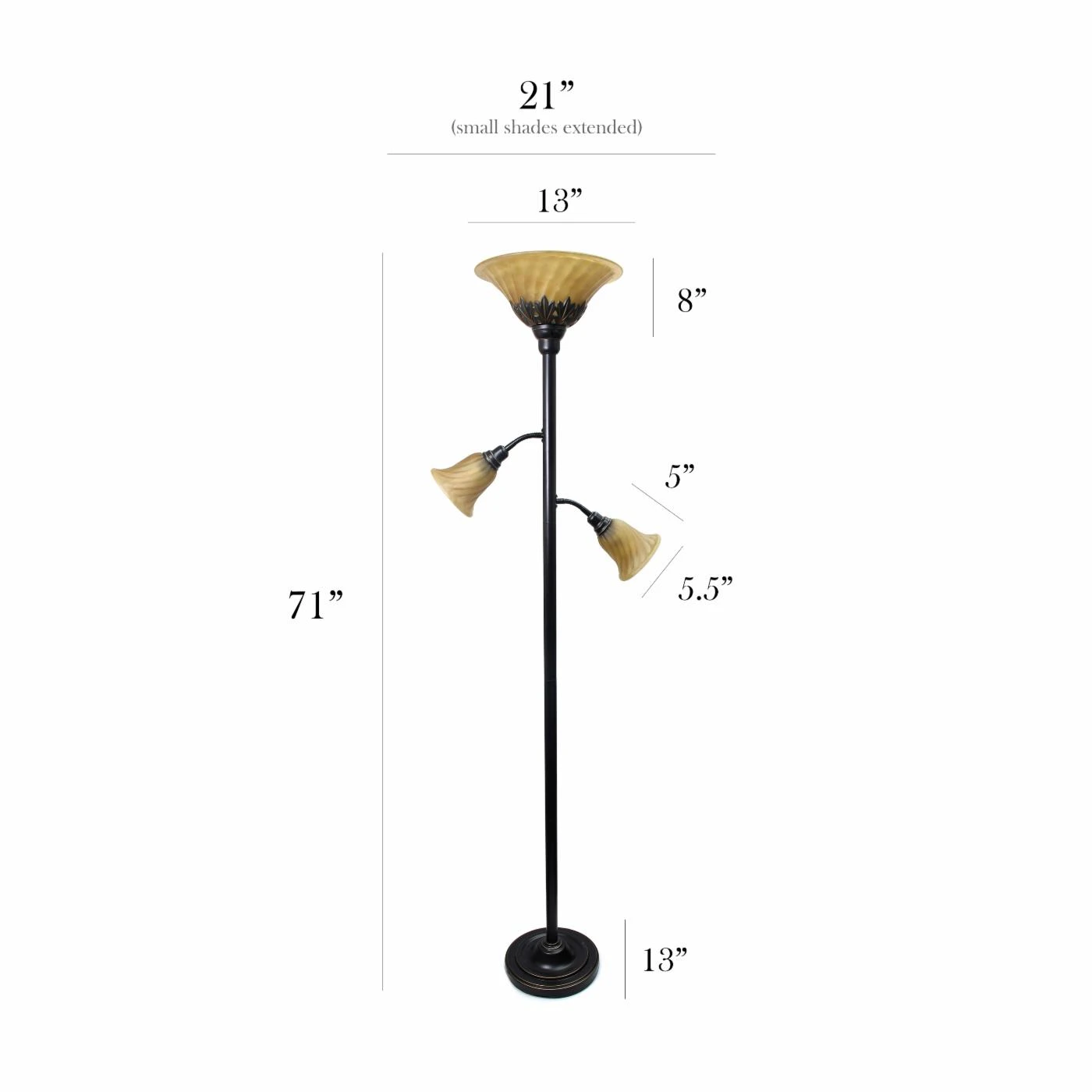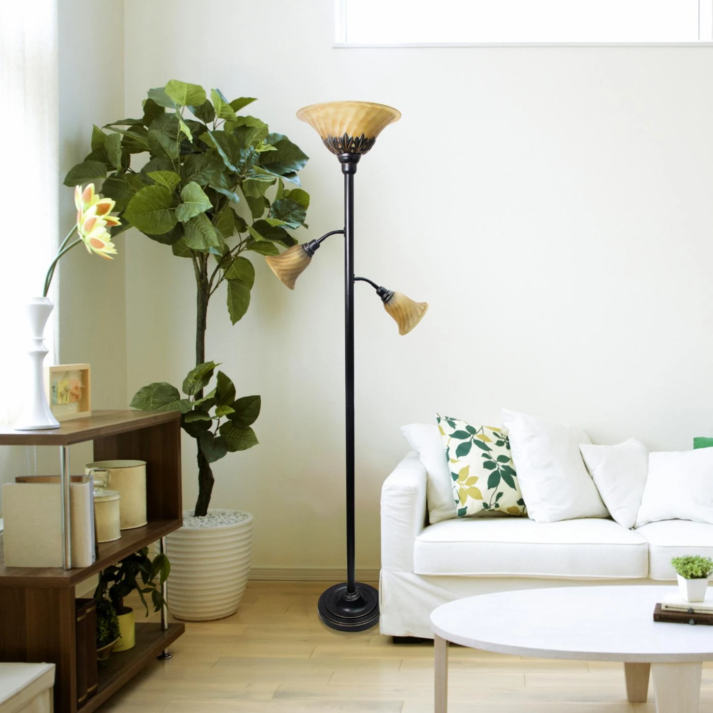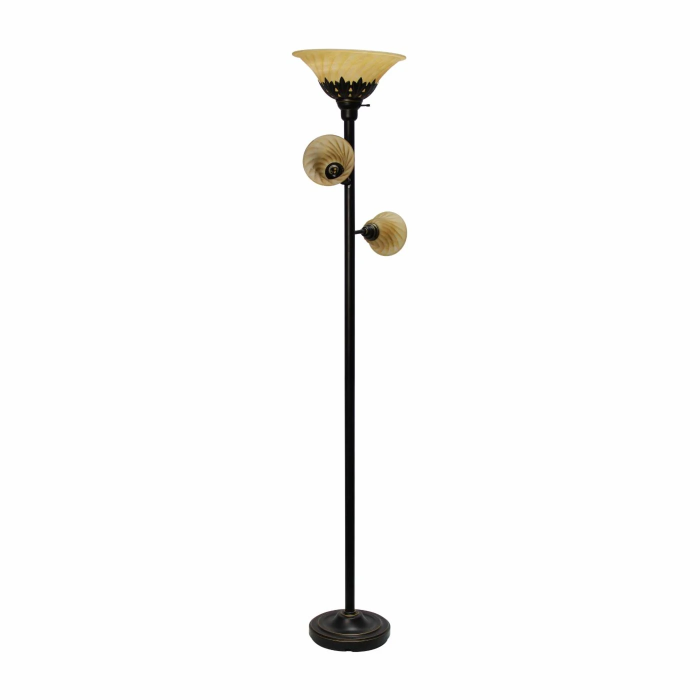 Maximize the amount of light in your living space with the Elegant Designs 3 Light Floor Lamp. Its antique-inspired restoration bronze-finished design includes two reading task lights and one ambient torchiere light with amber scalloped glass shades. Each light operates independently to suit your needs.