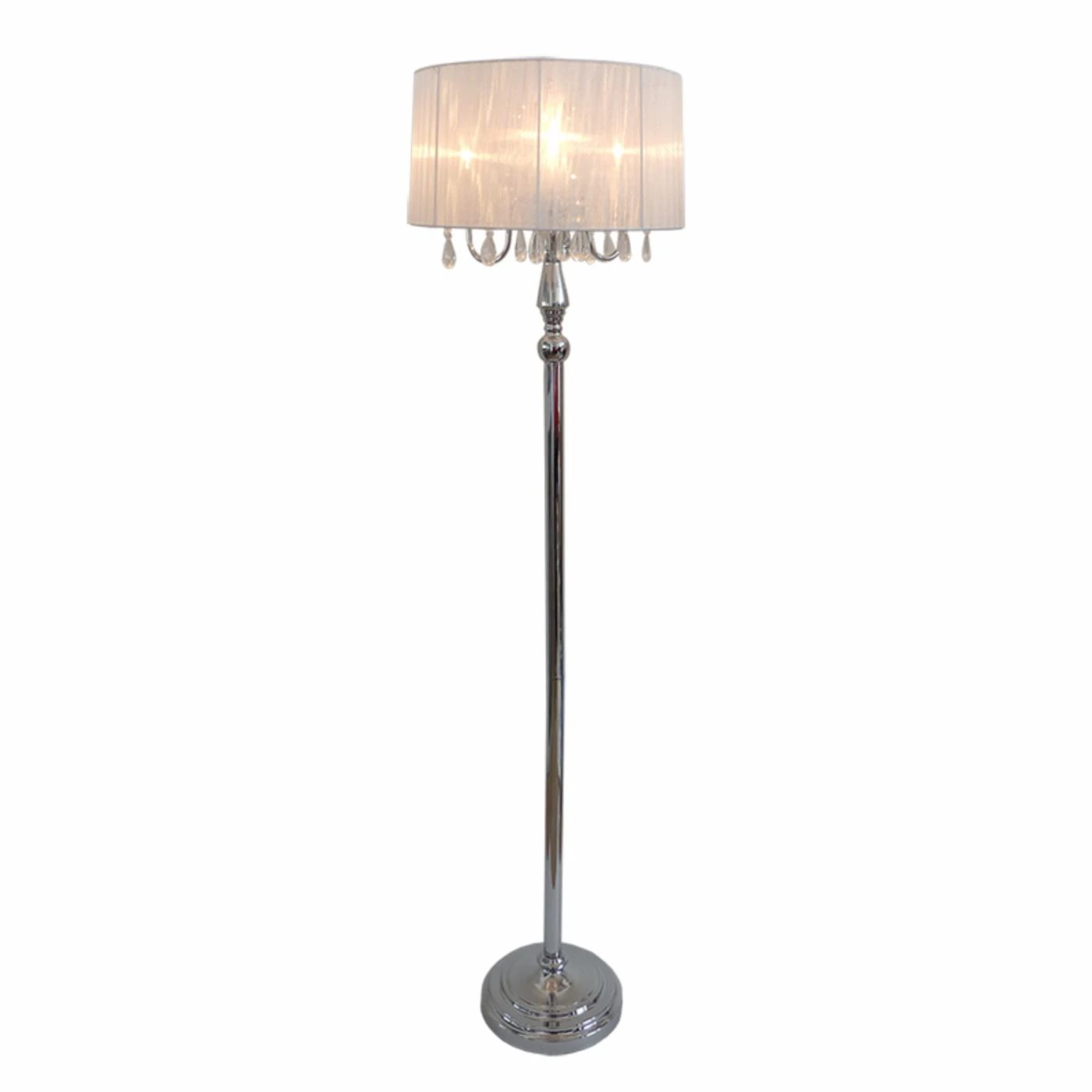 Perfect for the boudoir, the Elegant Designs Floor Lamp – 61H in. – White Shade was inspired by sparkling chandeliers and lacy white lingerie. A stunning floor lamp, this one features a sheer white drum shade and crystal clear beads that catch the light and eye. Its slender metal base features classic details and a chrome finish that rounds out the look perfectly. This floor lamp requires three 40-watt bulbs (not included).