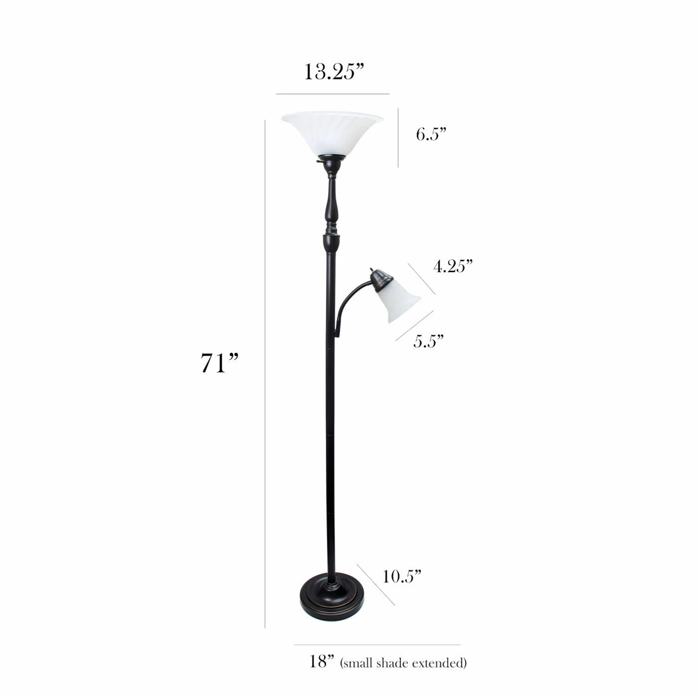 Enjoy some extra light for reading with the Elegant Designs Mother Daughter Floor Lamp, a two-in-one design with a task light and a torchiere for ambient lighting. Each light operates independently and is covered with a white marble glass shade that softens its glow. A dark restoration bronze finish gives the lamp an appealing aged look.