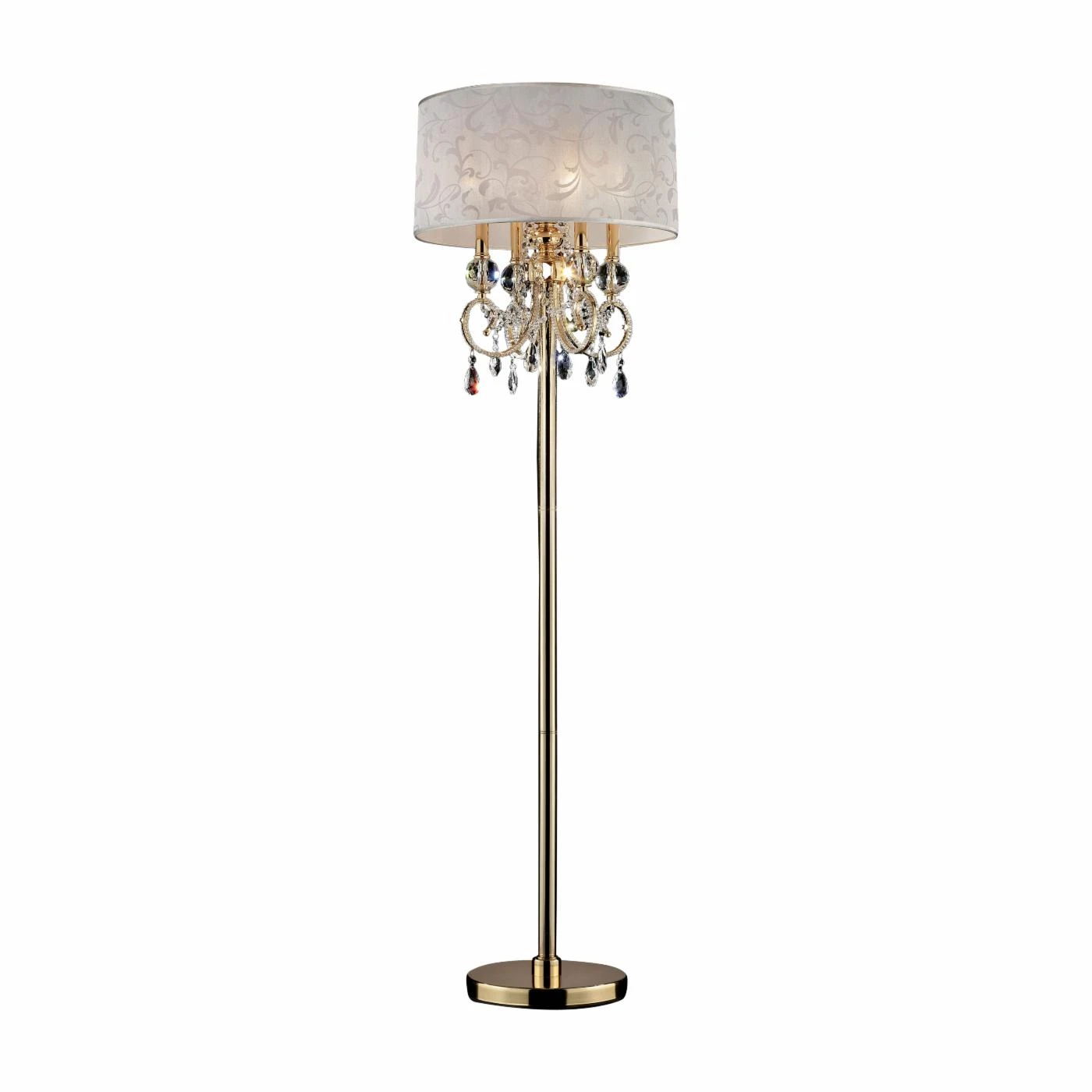 Elevate your space with the Furniture of America Janelle Floor Lamp. This striking gold floor lamp features a flourish of curled arms lined and dripping with teardrop crystals. The soft white drum shade is adorned with a light floral design for added sophistication and charm. A subtle foot switch makes it easy to turn on and off. Requires four 40-watt bulbs (included).