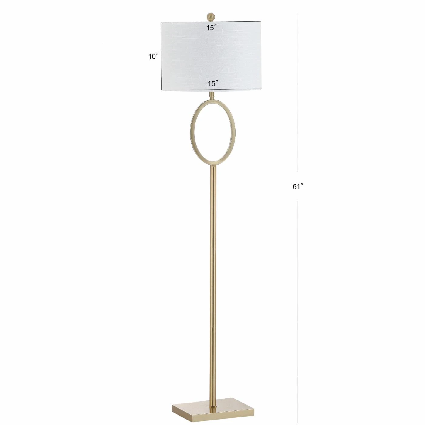 The slender brass-plated JONATHAN Y April LED Floor Lamp is punctuated with a dynamic hoop detail. For a crisp finishing touch, it features a white cotton drum shade, gleaming brass finial, and silk-wrapped cord you won’t want to hide, but easily can. This floor lamp requires one bulb and is compatible with any 12-watt LED, 100-watt type A, or 23-watt CFL. A nine-watt LED bulb is included.