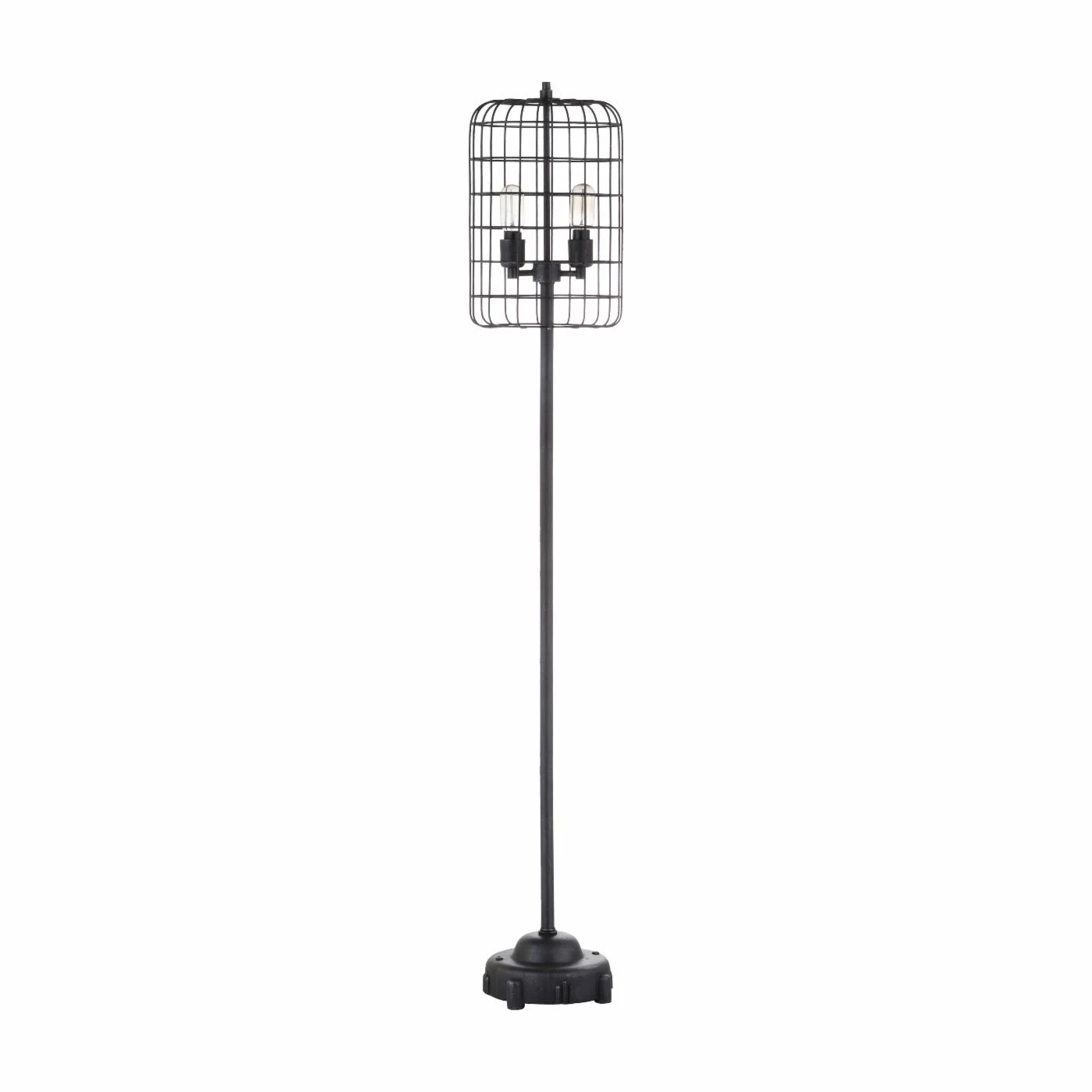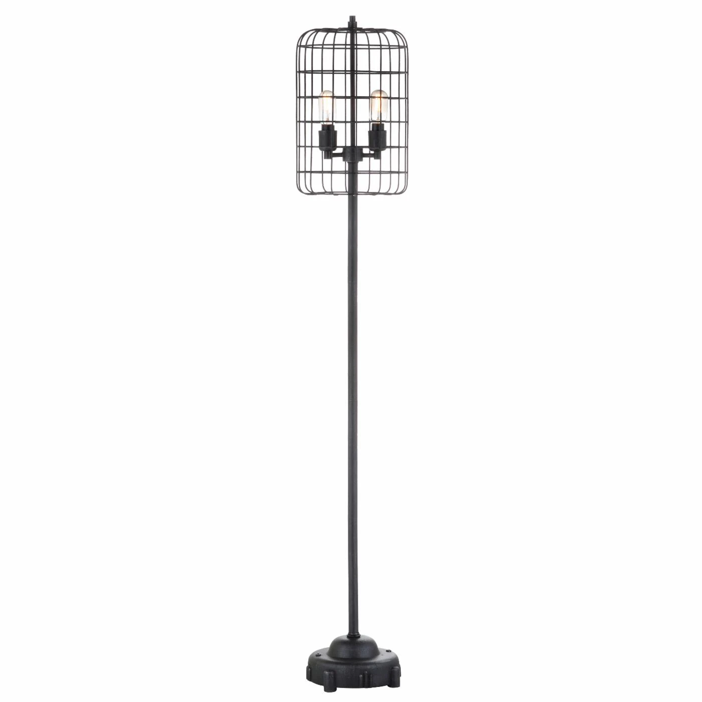The vintage JONATHAN Y Odette Table Lamp feature an exposed bulb design that was all the rage during the industrial revolution. Use this floor lamp to inspire a heritage feel. Its wire cage shade and detailed iron base are finished in black and silver. This retro floor lamp requires one bulb and is compatible with any 9-watt LED, 60-watt incandescent, or 13-watt CFL. A 25-watt Edison style bulb is included.